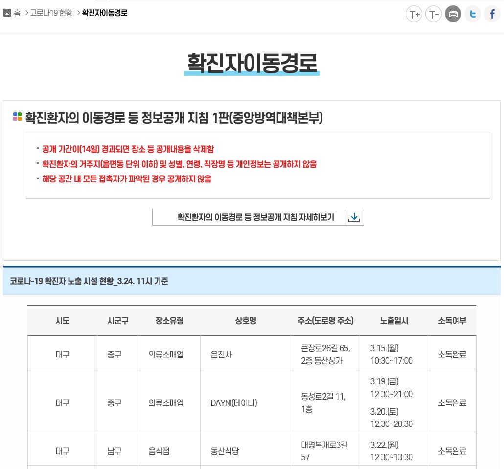 코비드 대구 홈페이지에 가면 확진지 이동경로가 있어 동선을 알아볼 수 있게 해 놓았지만