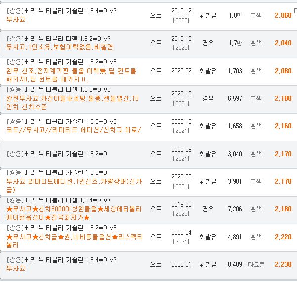 2000만원이 넘어가는 베리 뉴 티볼리 중고차들도 보이고 있습니다.