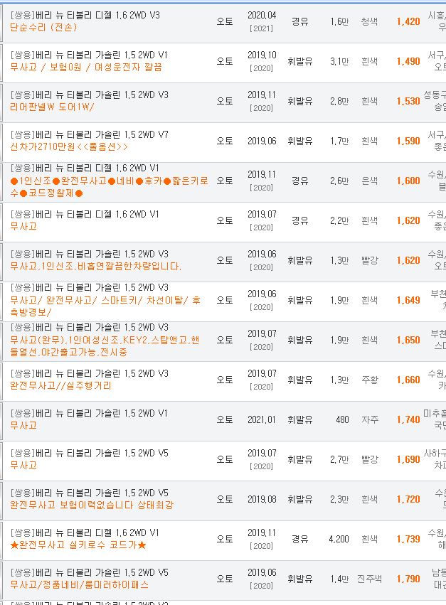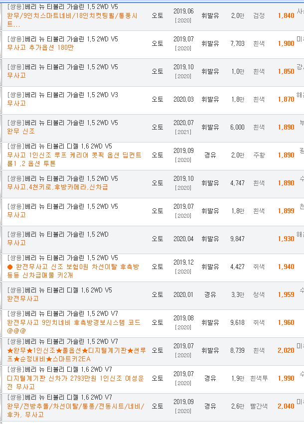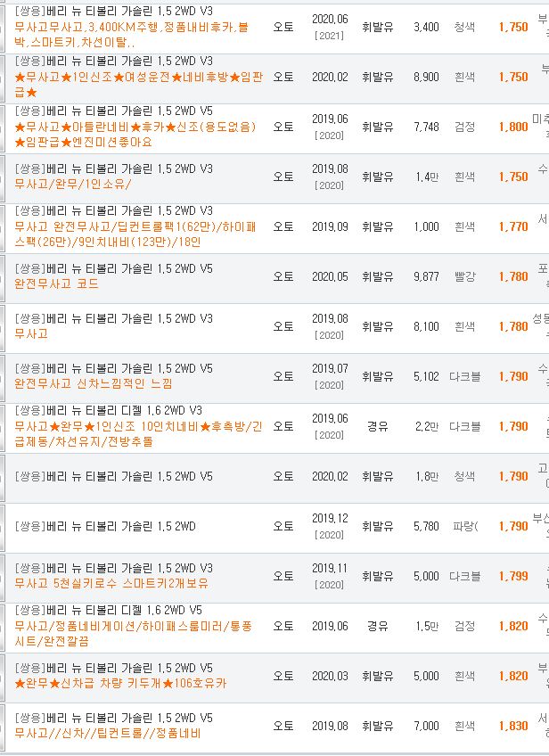 대부분의 베리 뉴 티볼리 중고차가 1500만원에서 2000만원 사이에서 판매가 되고 있는 것으로 보입니다.