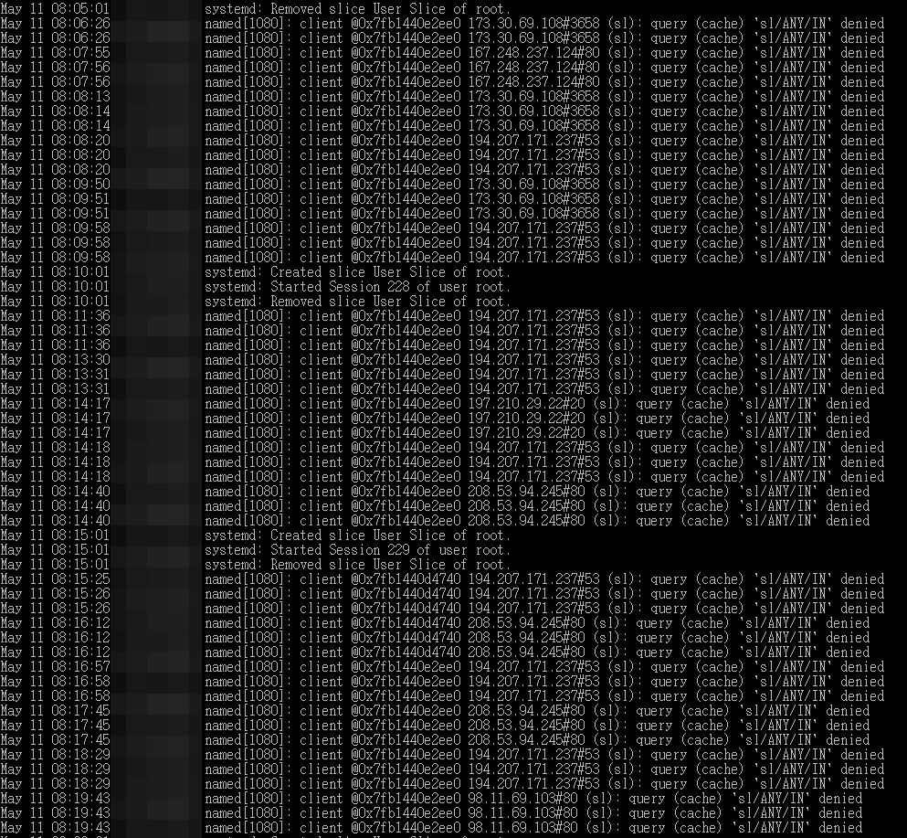 May 11 09:08:56 hostname named[1080]: client @0x7fb1440c5fa0 193.14.247.225#53 (sl): query (cache) 'sl/ANY/IN' dMay 11 09:10:27 hostname named[1080]: client @0x7fb1440c5fa0 193.14.247.225#53 (sl): query (cache) 'sl/ANY/IN' denied