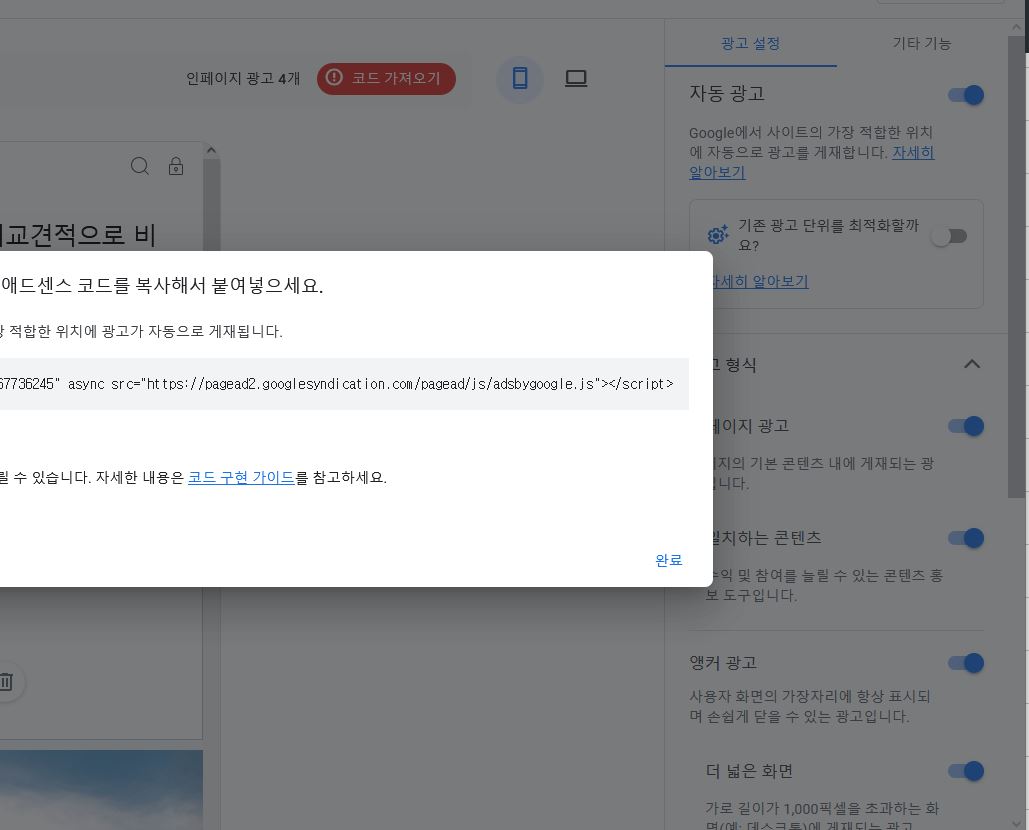 위에 살짝 보이는 코드를 페이지 헤드 부분에 추가를 하고 우측의 자동 광고에 온을 해 주면 된답니다.
