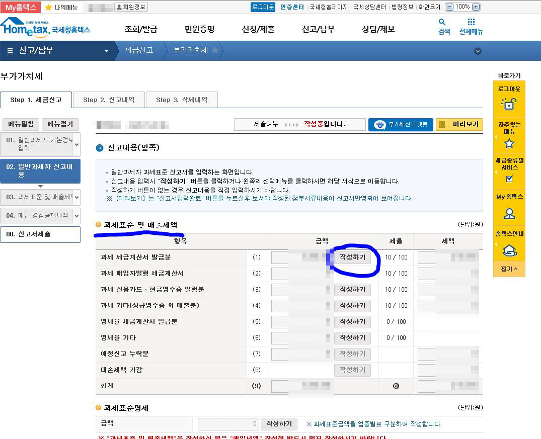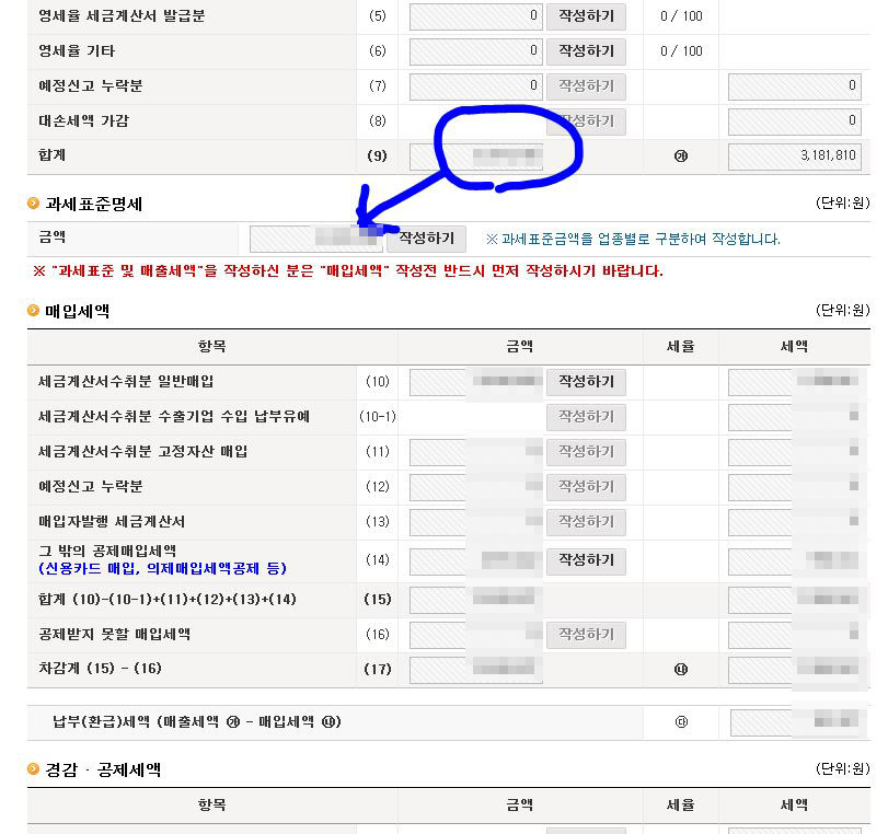 과세표준 및 매출세액을 입력하고 나면 과세표준명세에도 기록을 해 줘야 합니다.