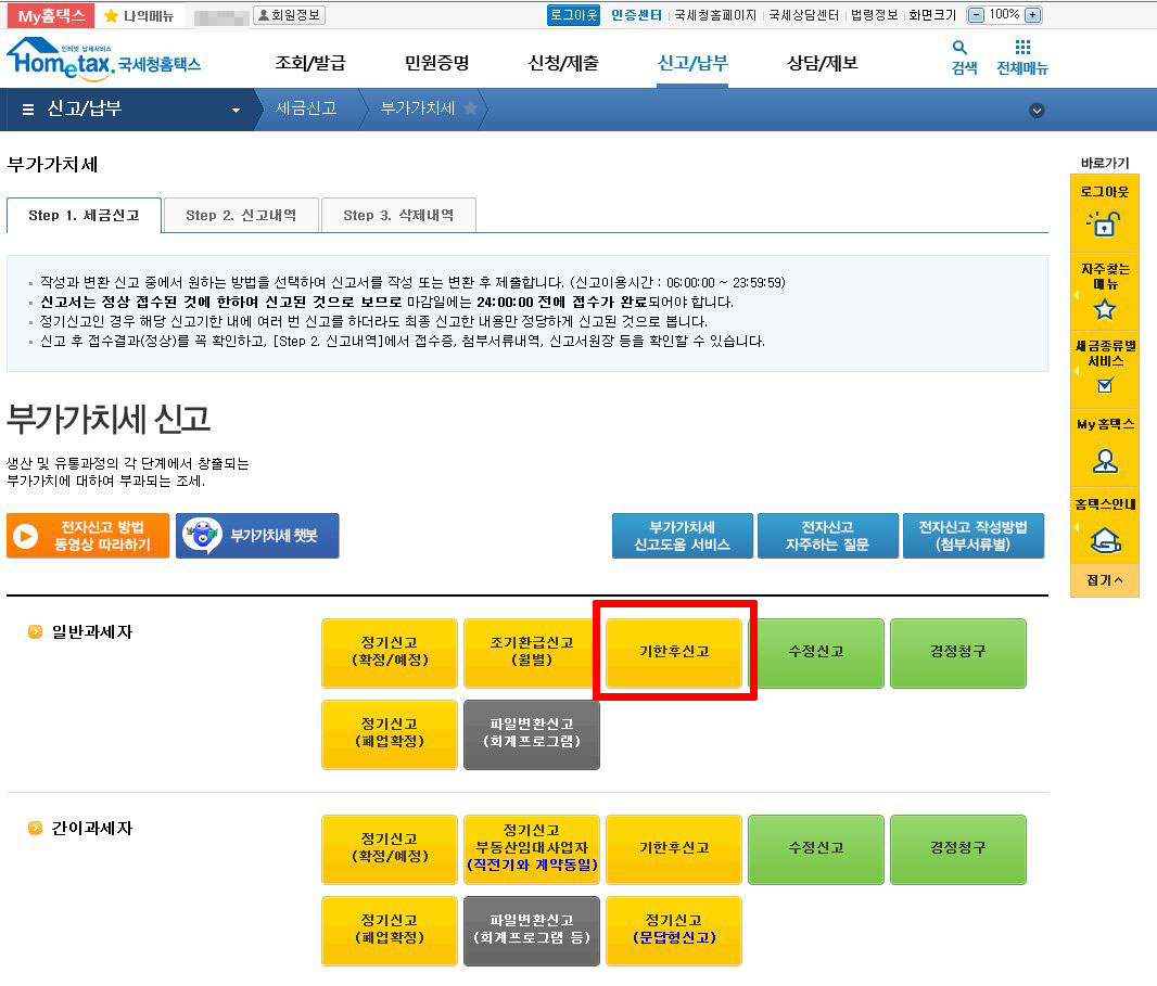 저는 기간이 지나고 신고를 하기 때문에 "기한후신고' 버튼을 클릭하였습니다.