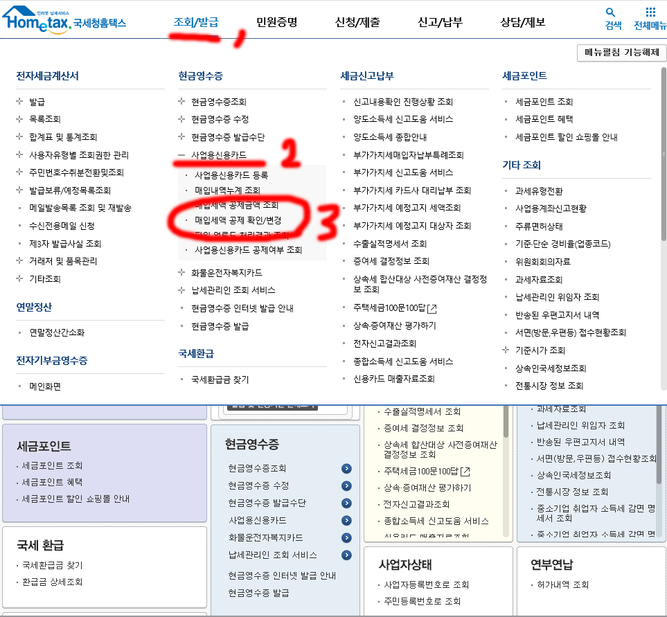 "조회/발급' 메뉴에서 '사업용신용카드" 하단의 "매입세액 공제 확인/변경" 클릭합니다.