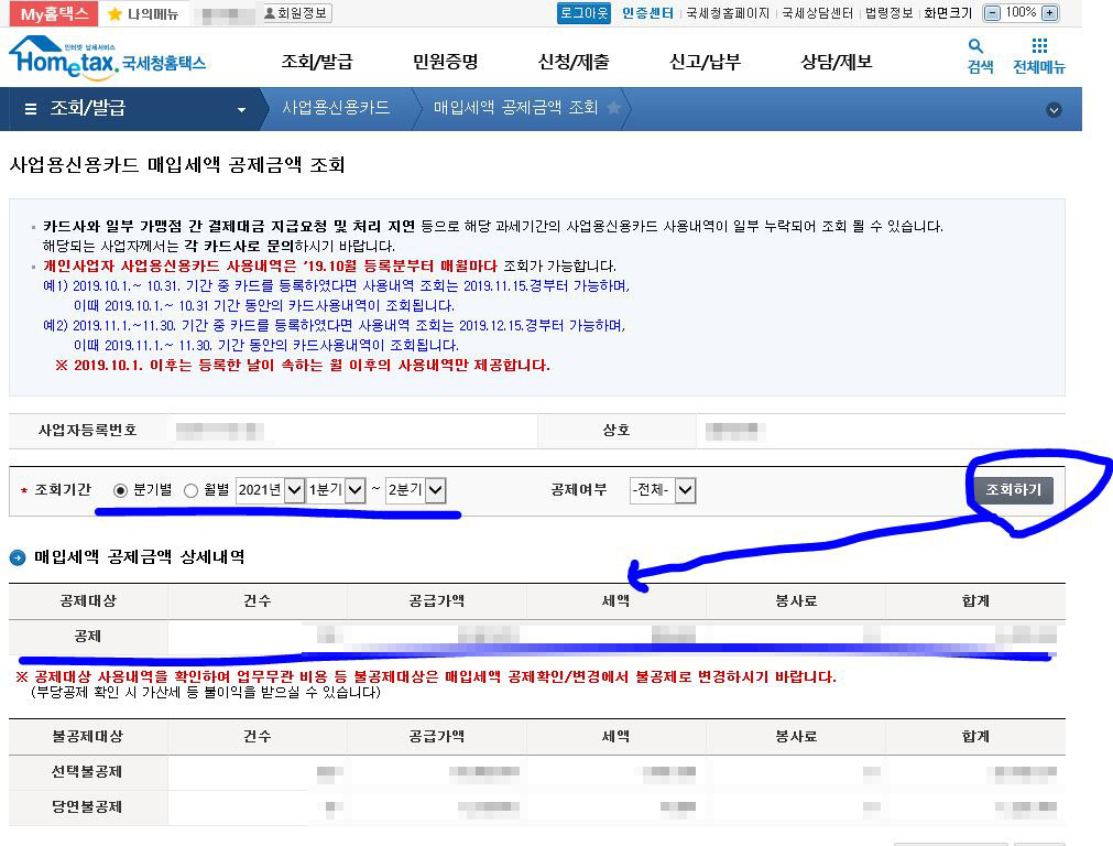 조회하기를 클릭하면 금액이 나오지만 부가세와 분리되어 표시가 안 되어 있더라구요.