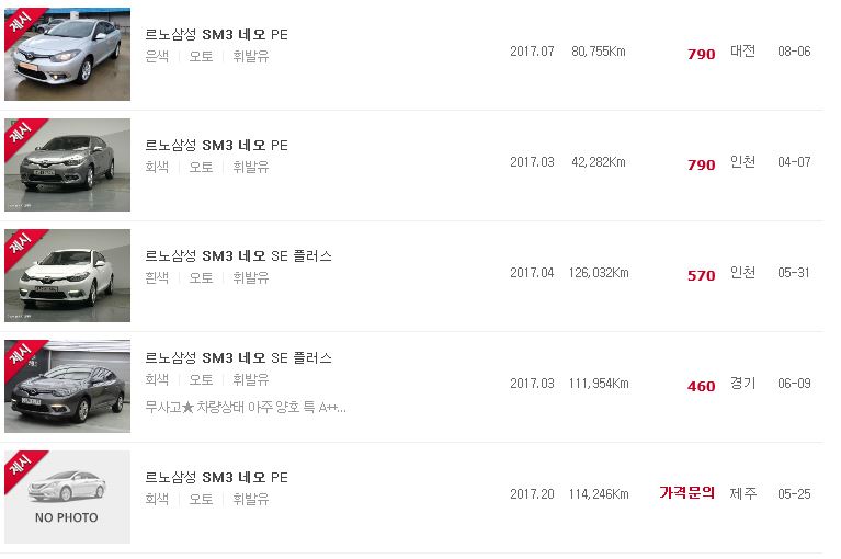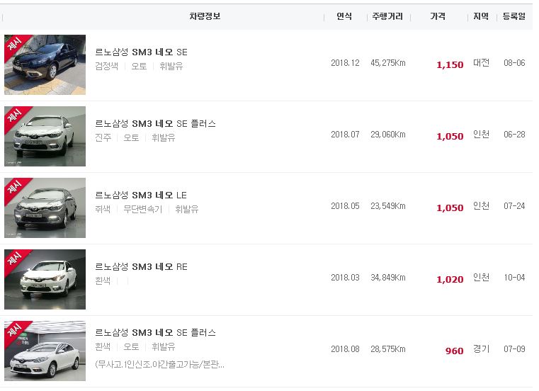 현재 중고차판매 되고 있는 가격이 1,000만원 넘어가는 SM3 네오 차량은 거의 안 보이고 있습니다.