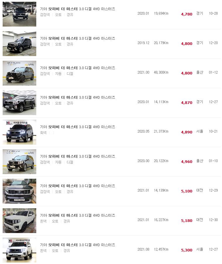 평균적으로 보면 모하비 더 마스터의 중고차가격은 4,400만원에서 5,000만원선으로 잡으면 크게 무리는 없을 것 같습니다.