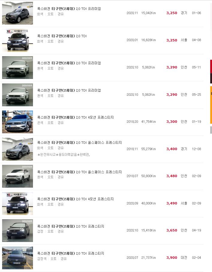 좀 더 저렴한 티구안을 원하신다면 1세대 티구안을 알아보시면 좋겠습니다.