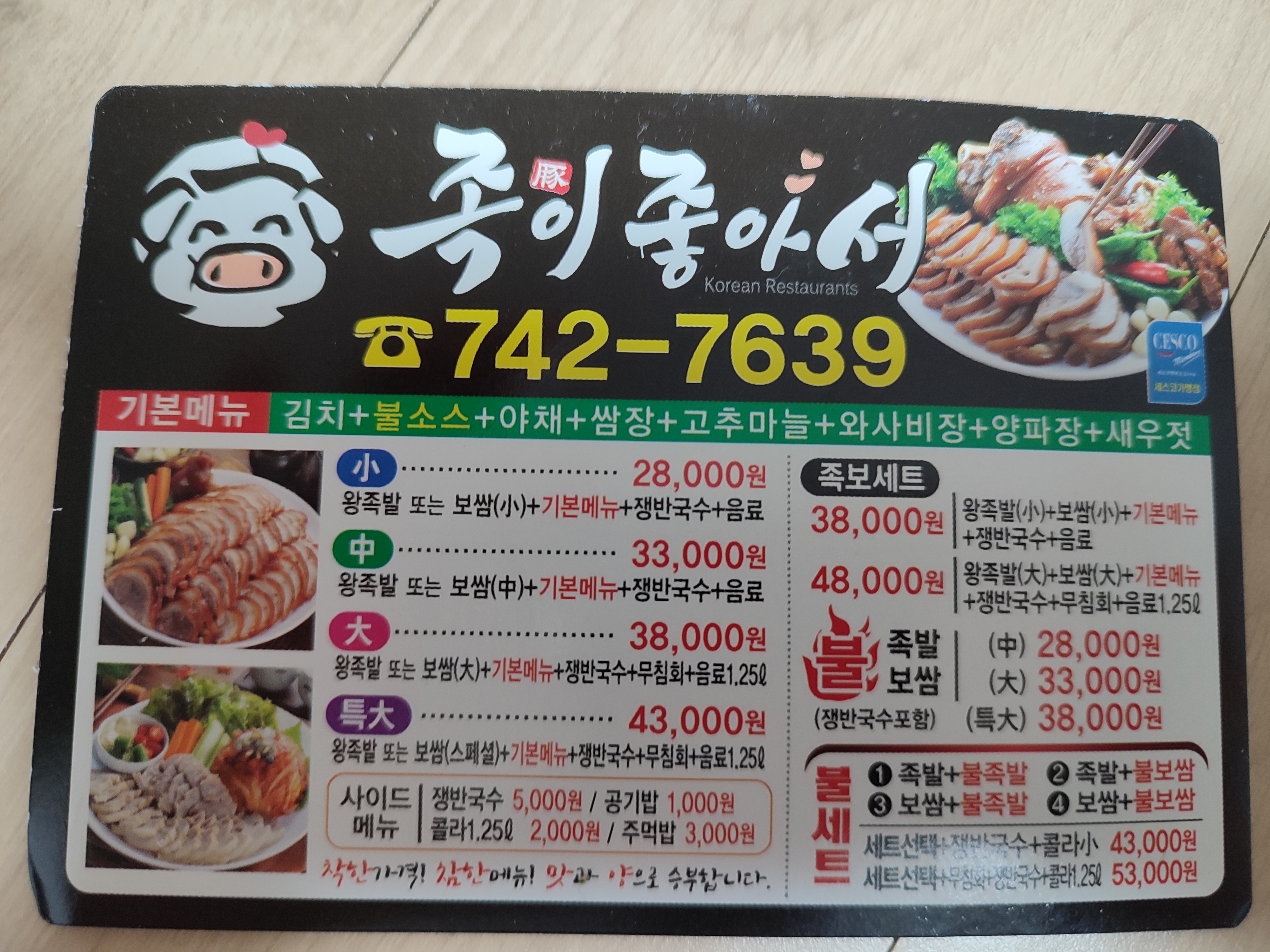 배달 봉지에 들어 있는 메뉴판입니다.