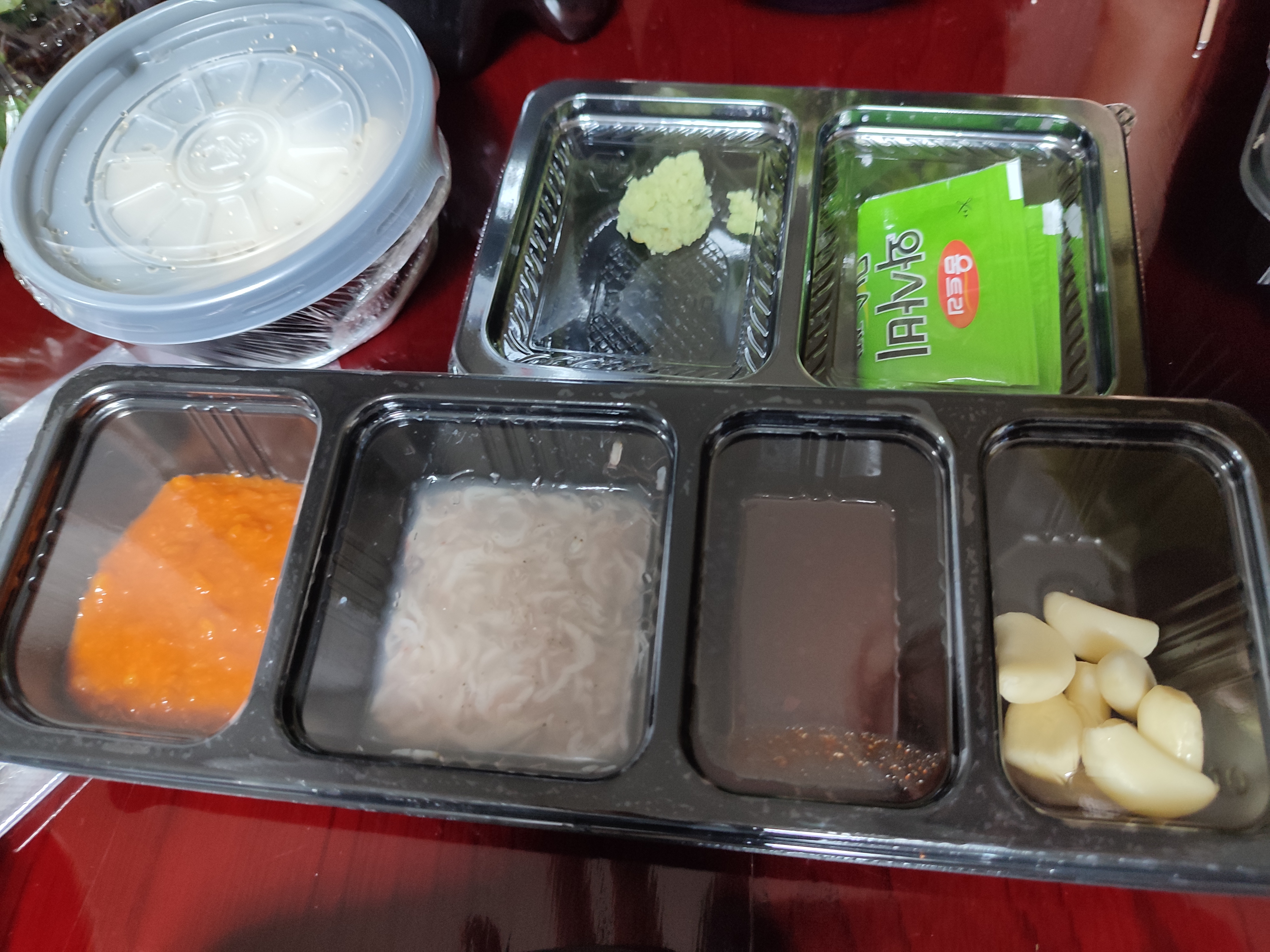 메인반찬에는 김치 3종류와 쌈장, 새우젖, 매콤양념소스, 마늘이 왔습니다.