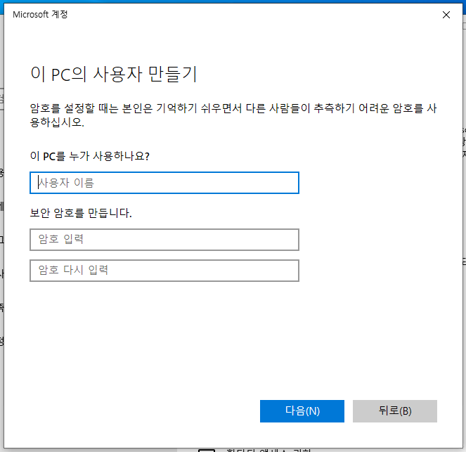 드디어 로컬 계정을 만들 수 있는 화면이 나왔습니다.