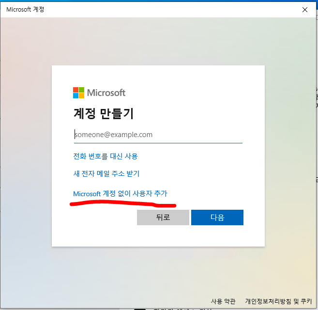 이 곳에서 메일 주소가 아닌 "Microsoft 계정 없이 사용자 추가"를 클릭합니다.