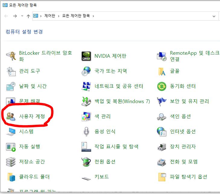 제어판에 들어오면 위와 같이 사용자 계정이라는 항목이 있습니다.