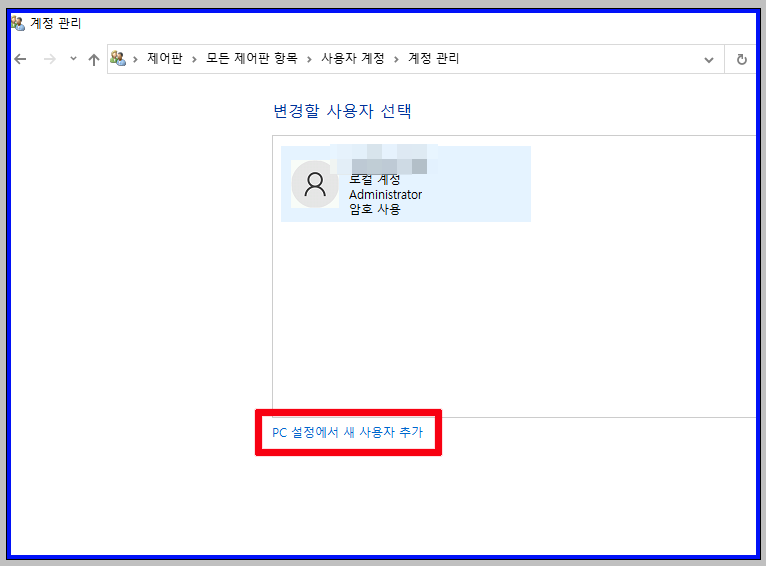 여기에서 "PC 설정에서 내 계정 변경" 또는 "다른 계정 관리"를 클릭합니다.