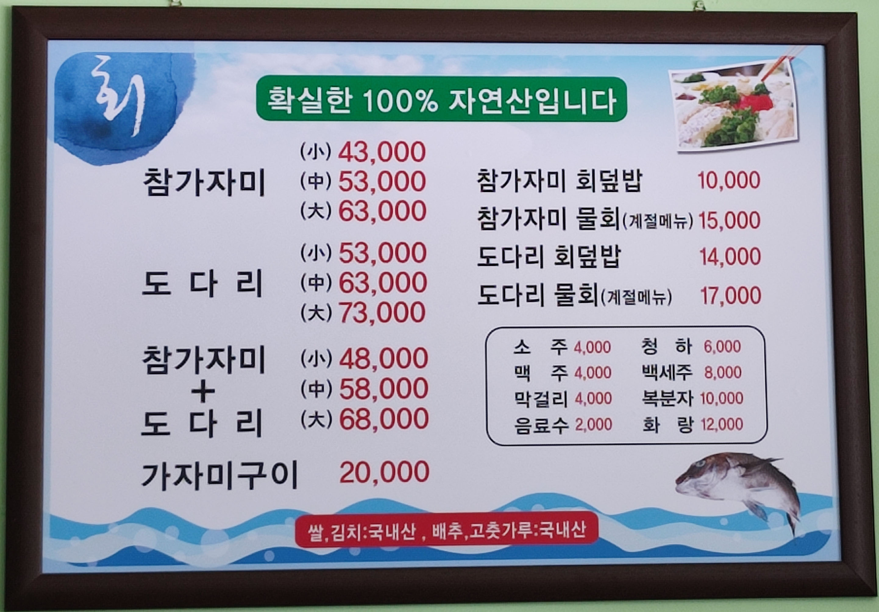 가격표를 보니 회 종류는 3,000원씩, 참가자미구이는 5,000원, 감가자미 회덮밥은 1,000원, 물회와 도다리 회덮밥은 2,000원씩 오른 것 같습니다.