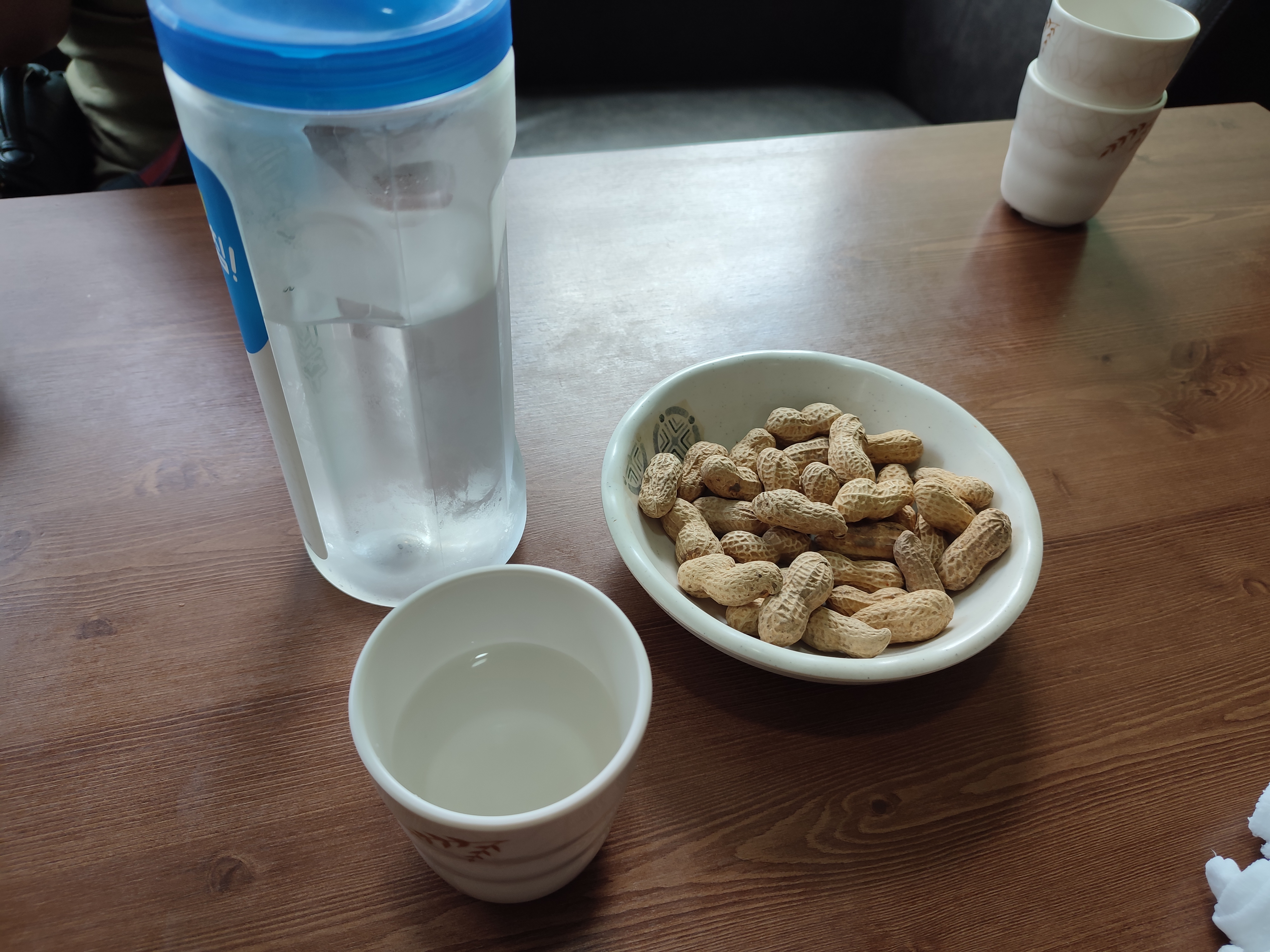 테이블에 앉으면 위와 같이 물과 땅콩을 가져다 주세요.
