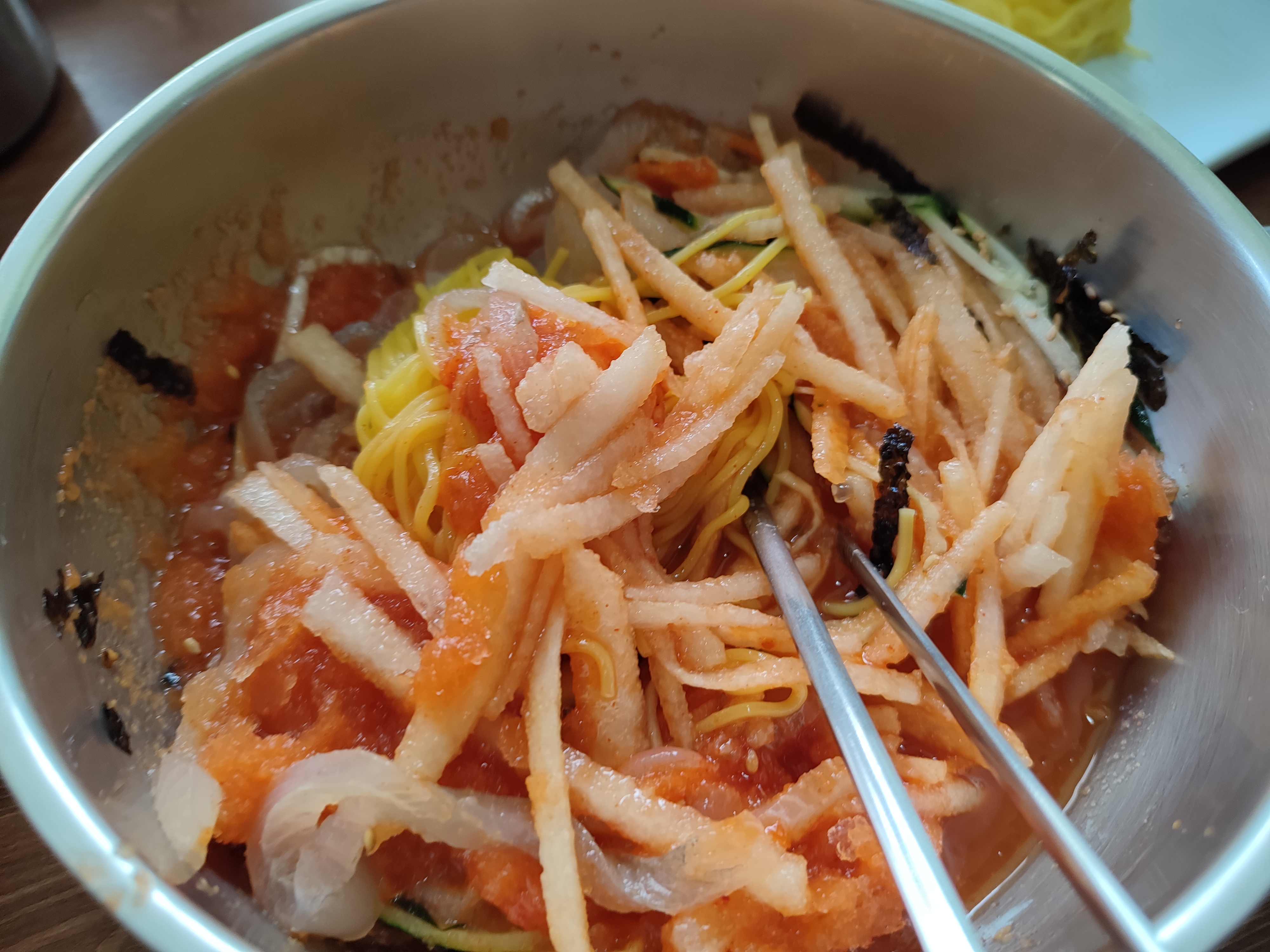 국수를 넣고 조금 비비다가 사진을 찍어 보았습니다.