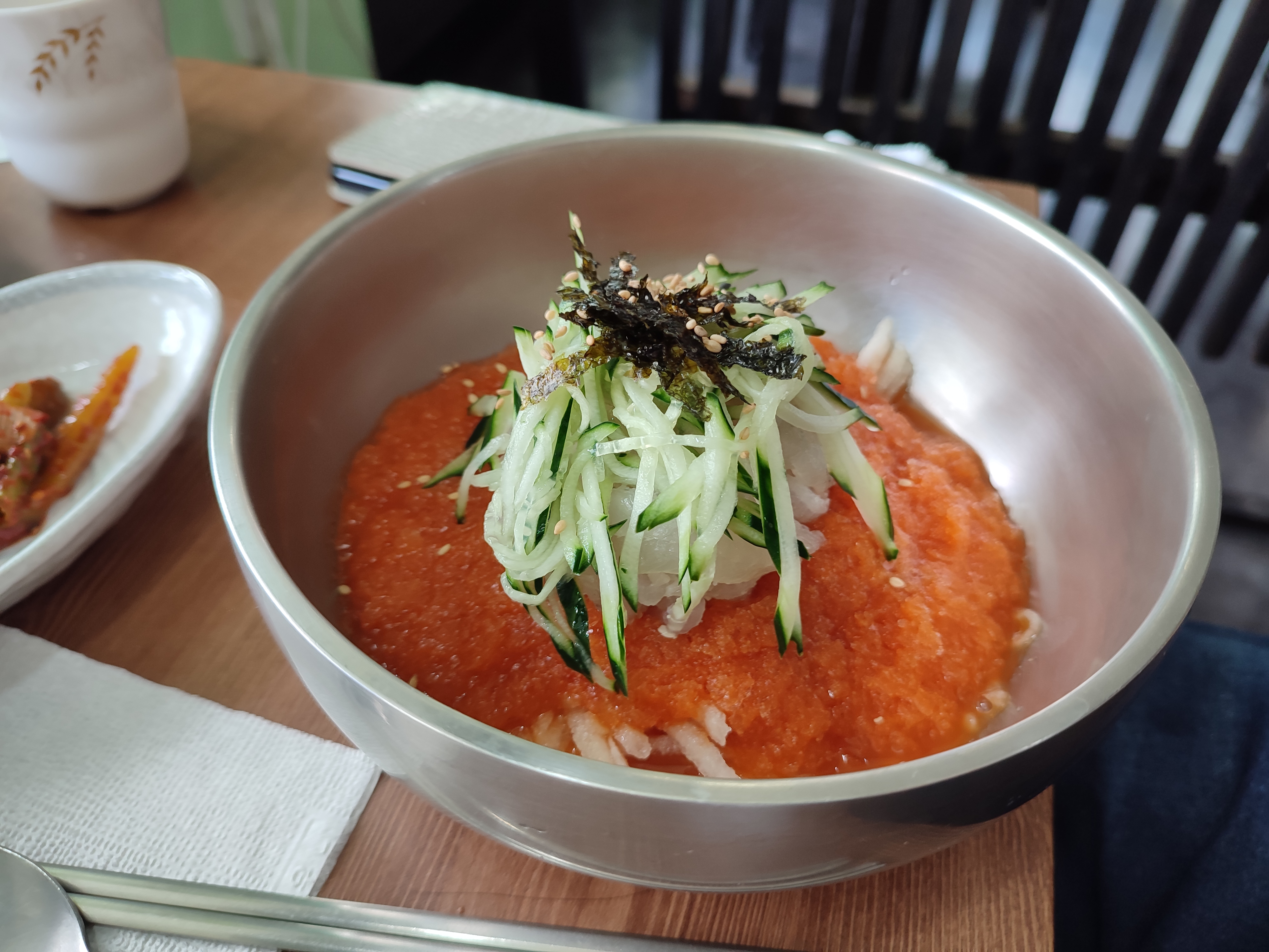오늘 점심은 선지해장국을 먹으려다가 너무 더워서 물회집으로 갔습니다.