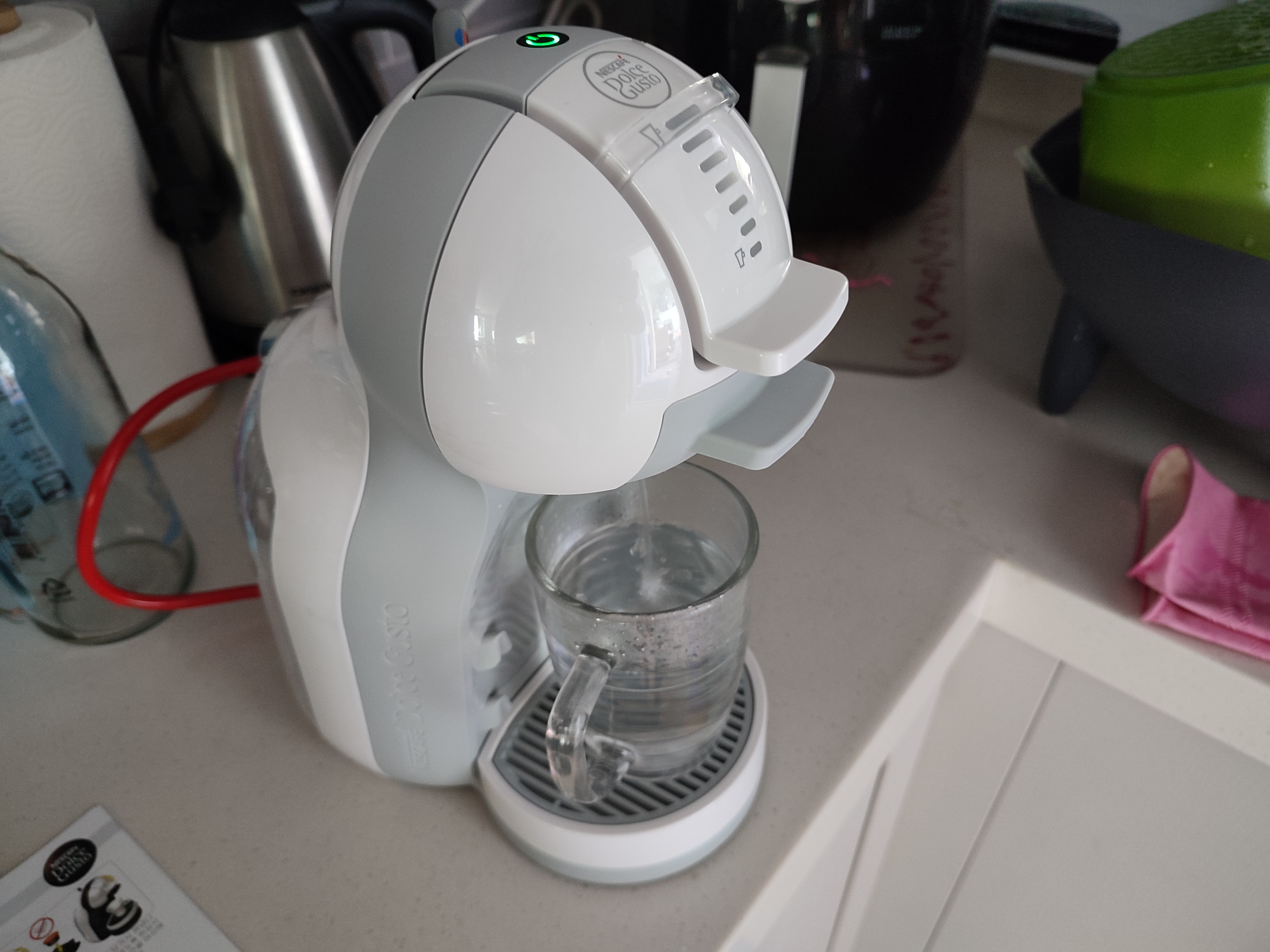 컵에 김이 있는 것으로 봐서는 따뜻한물을 내리고 있는 중이네요.