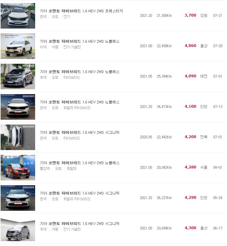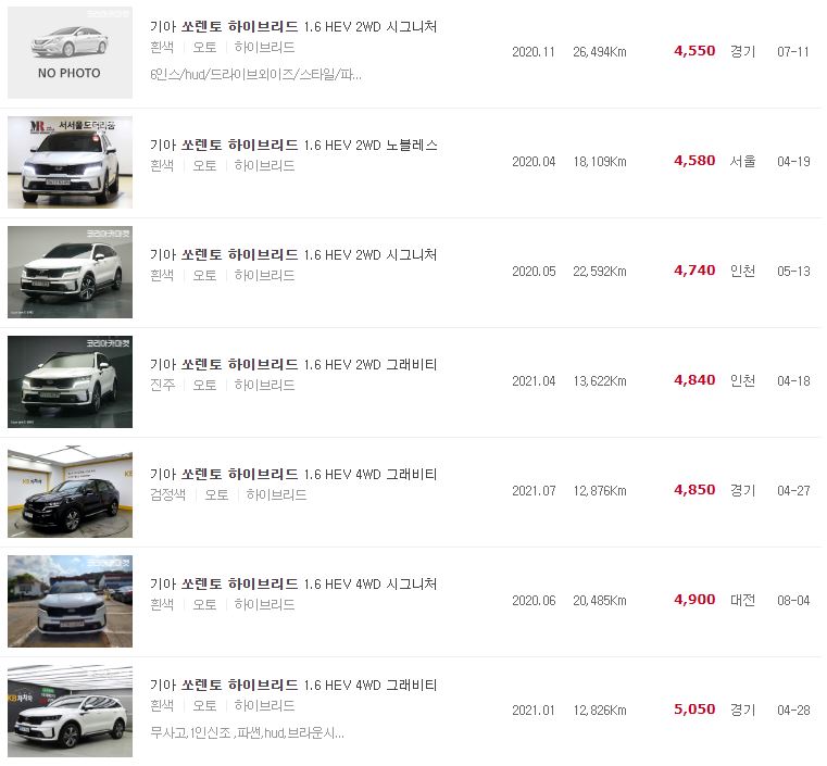 그럼 현재 중고차매매사이트에서 판매되고 있는 쏘렌토 하이브리드 중고차가격을 보도록 하겠습니다.