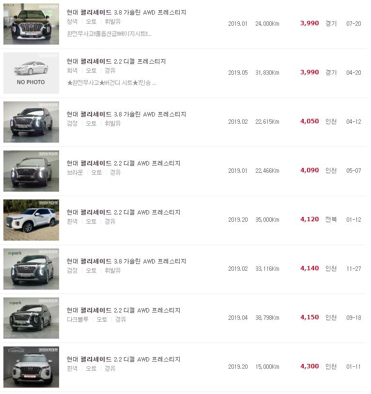 2019년식 중에서는 가장 고가의 팰리세이드 중고차는 4300만원에 판매가 되고 있는 프레스티지차량이네요.