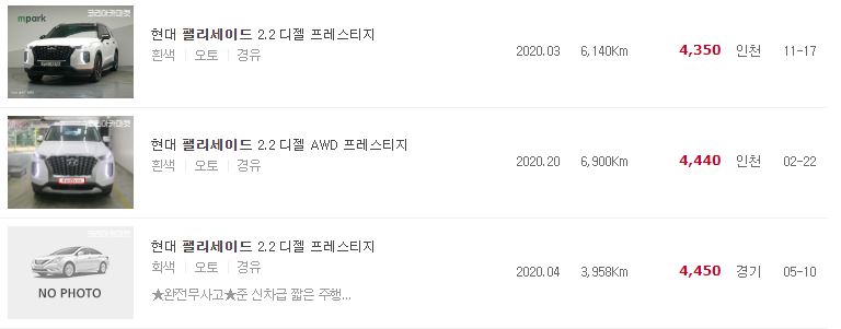가장 고가에 판매되고 있는 2020년식 팰리세이드 중고차는 4,450만원에 판매되고 있는 프레스티지 차량이 보이고 있습니다.