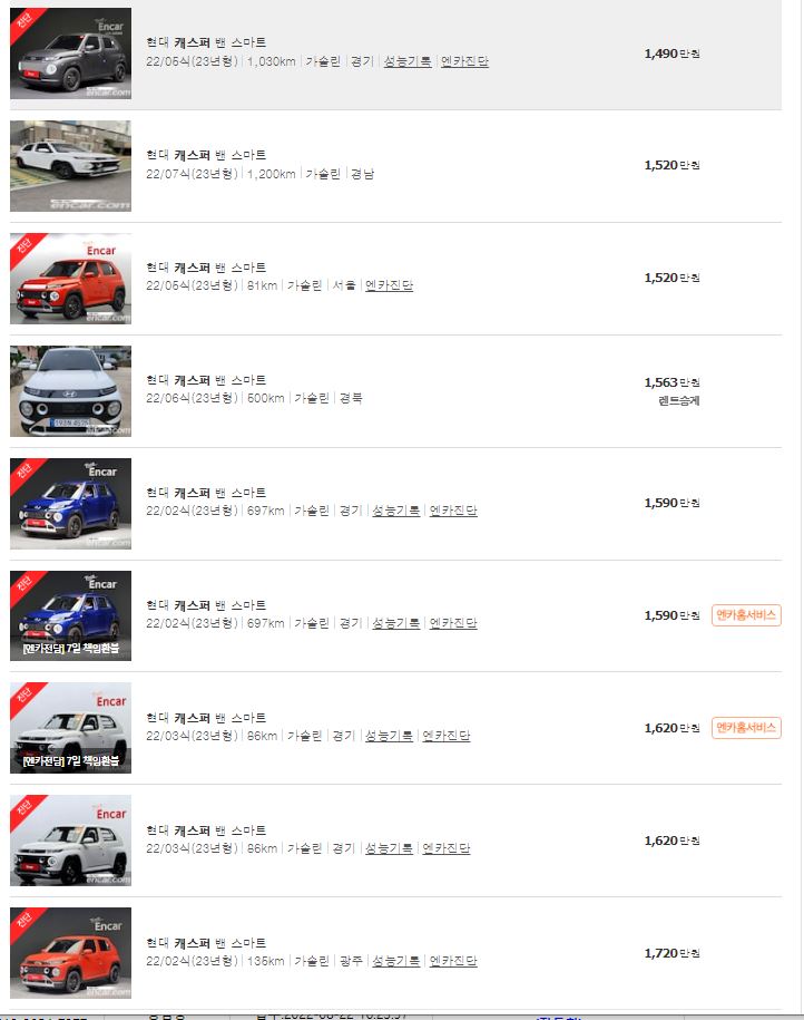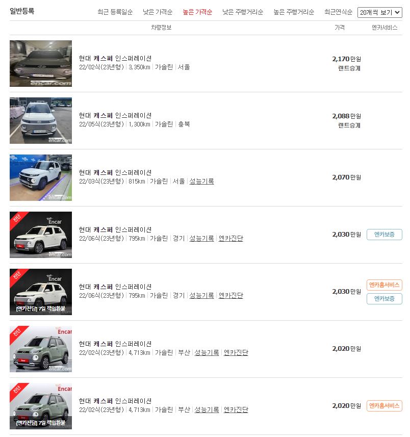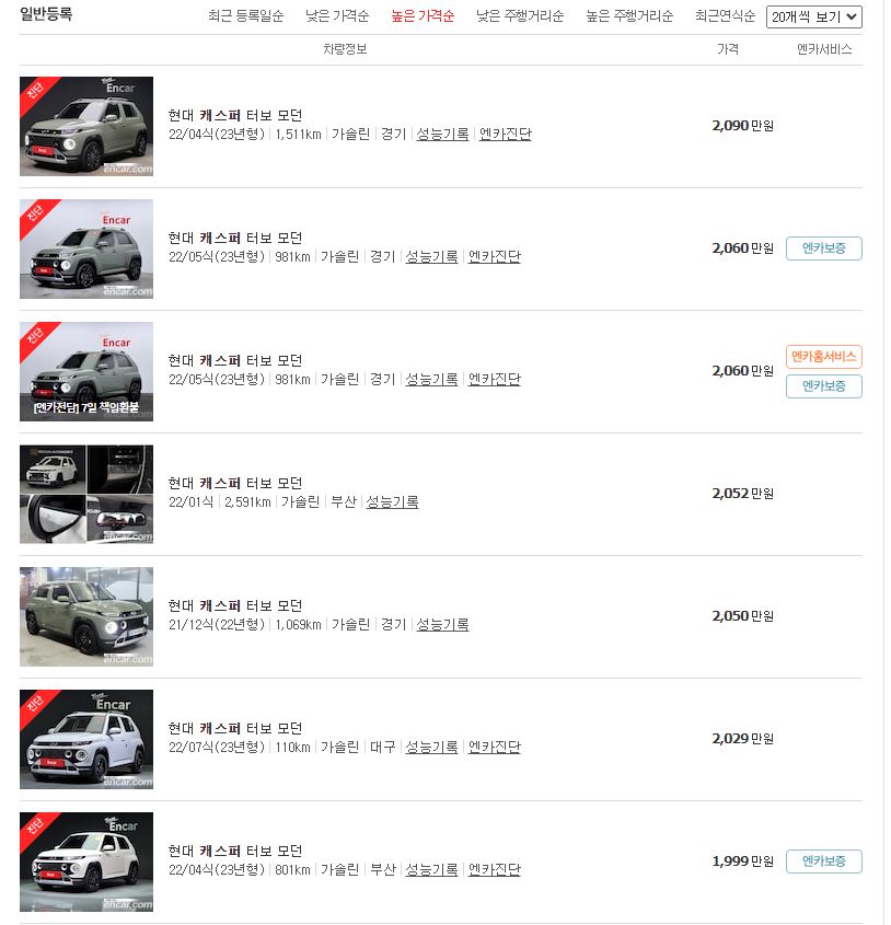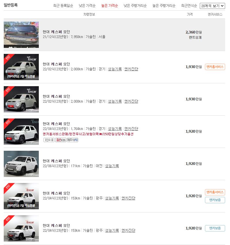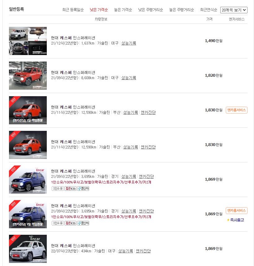 오늘은 중고차매매사이트 엔카에서 판매되고 있는 캐스퍼의 중고차시세를 알아보았습니다.