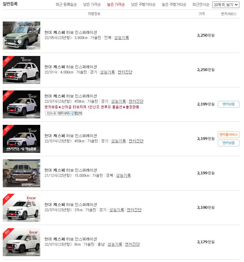 물론 선택품목에 캐스퍼 액티브도 있지만 엔카에서는 별도로 터보 인스퍼레이션이라고 구분을 하였으니 제외를 하고 말이죠.
