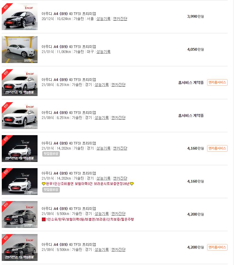 그럼 현재 수입중고차 아우디 A4의 판매가격을 보도록 하겠습니다.