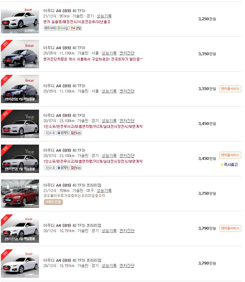 위에서 수입중고차 아우디 A4의 중고차가격을 알아보았는데요.