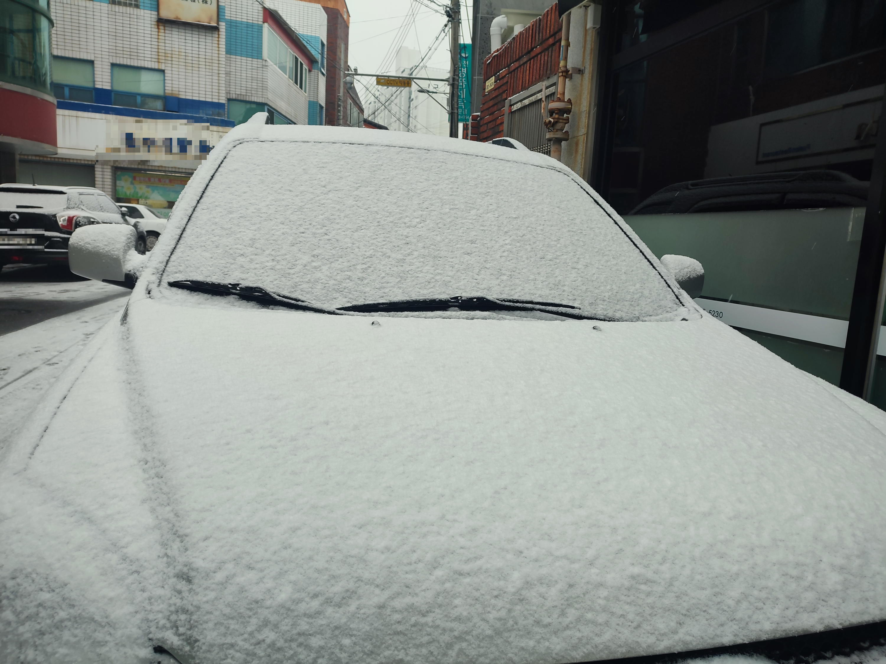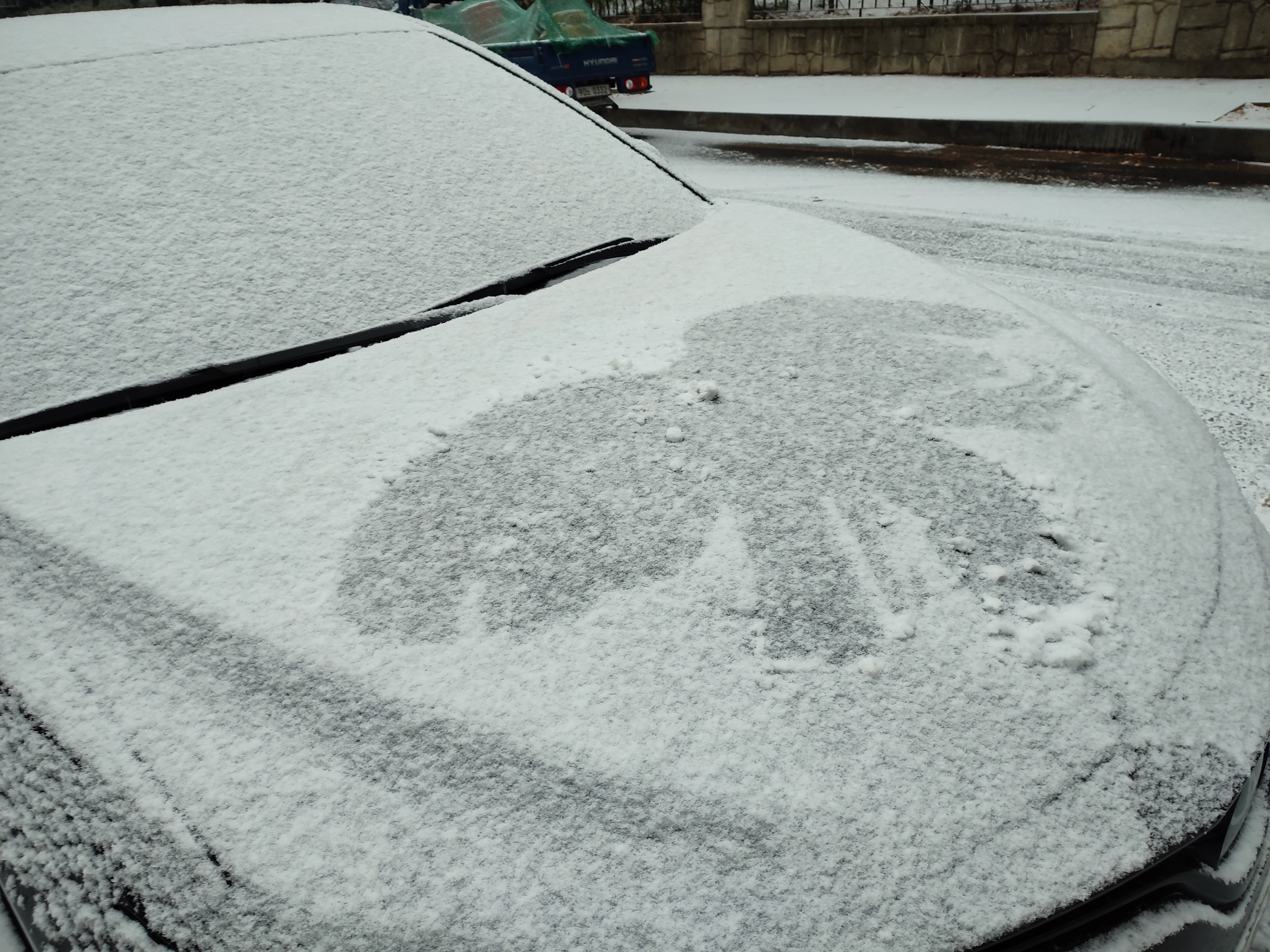 아이들이 등교하면서 보닛 위의 눈으로 그림을 그린 것도 보이네요.