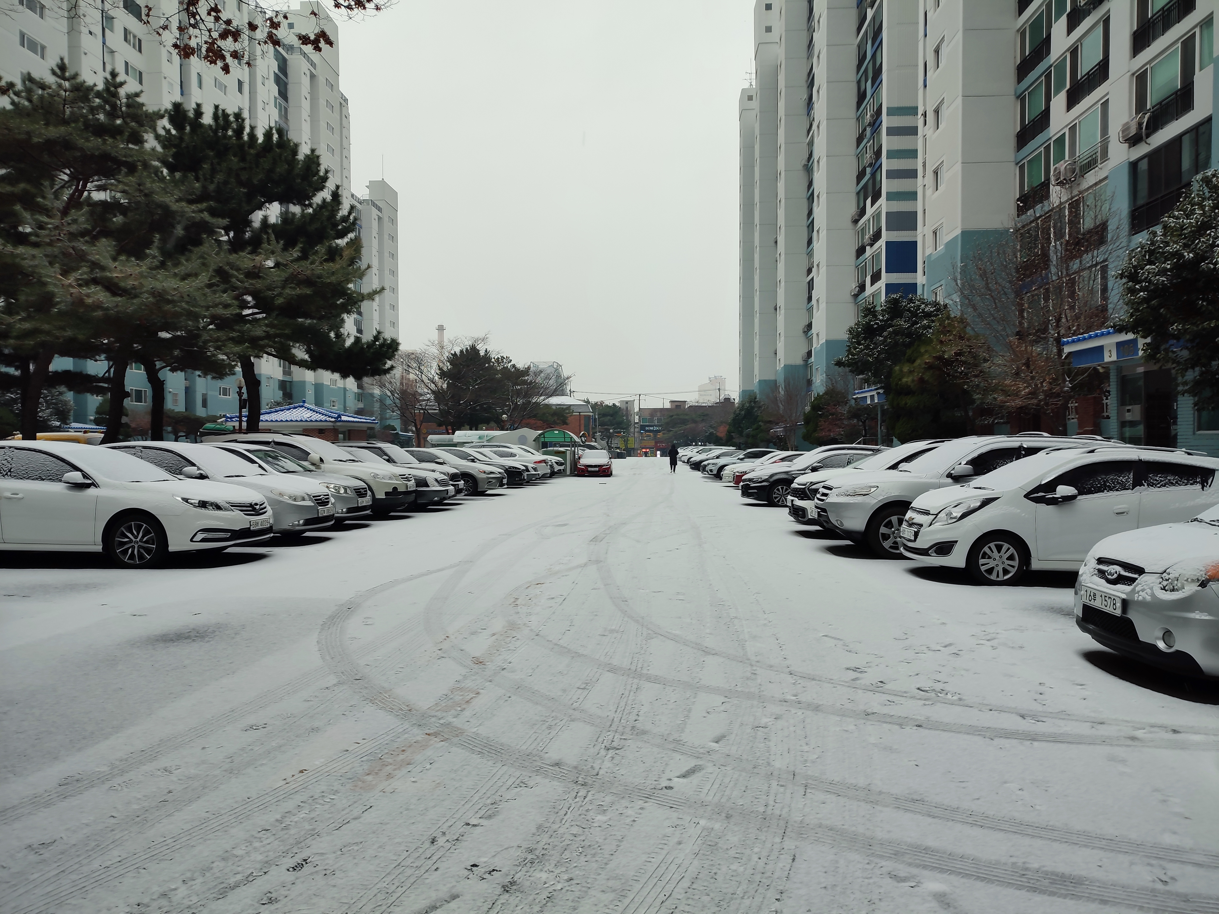 출근길에 눈이 내리니 많은 차들이 주차장을 지키고 있습니다.