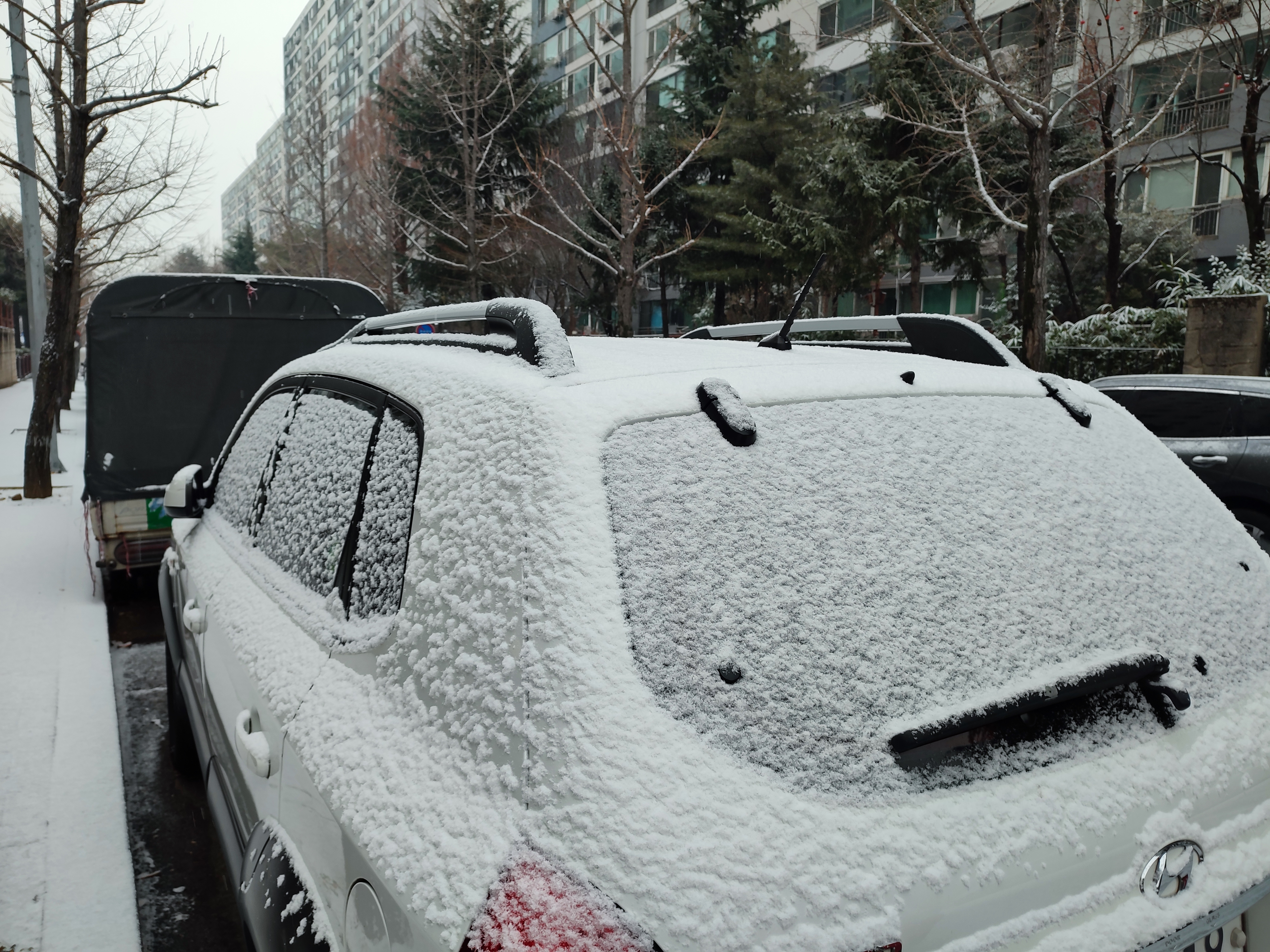 차 위에 눈들이 소복히 쌓여 있습니다.