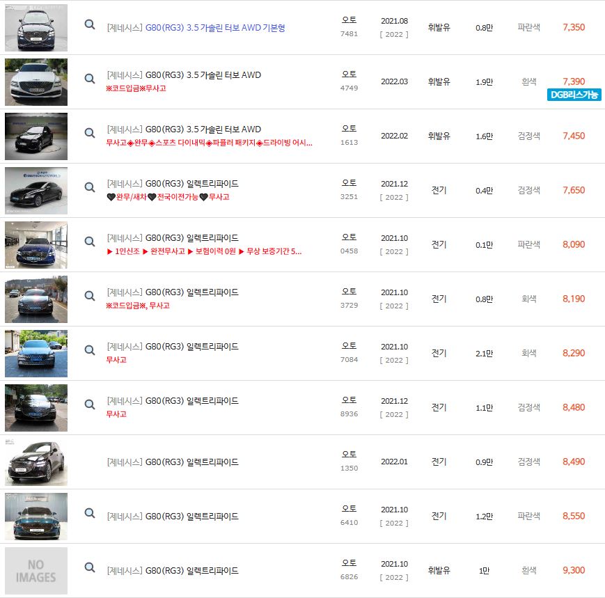 모든 제네시스 G80 리스트를 뽑아 보니 중고차로 나와 있는 매물이 너무 많습니다.