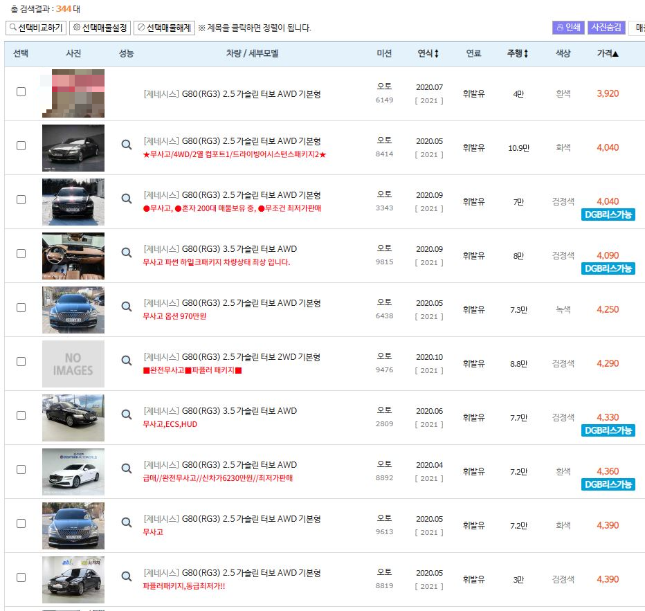 제네시스 G80 RG3 중고차 댓수가 너무 많다 보니 모든 매물 리스팅을 해 드리지는 못하고 최고가 매물을 보도록 하겠습니다.