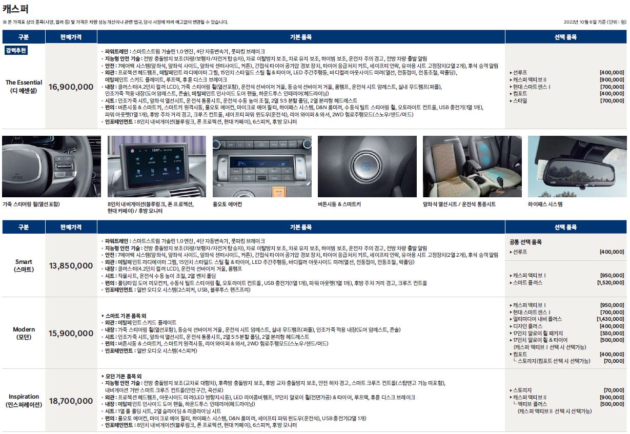 캐스퍼의 등급은 스마트, 모던, 인스퍼레이션 등급으로 구분되어 있으며 현재는 디 에센셜 등급이 추가되어 있습니다.