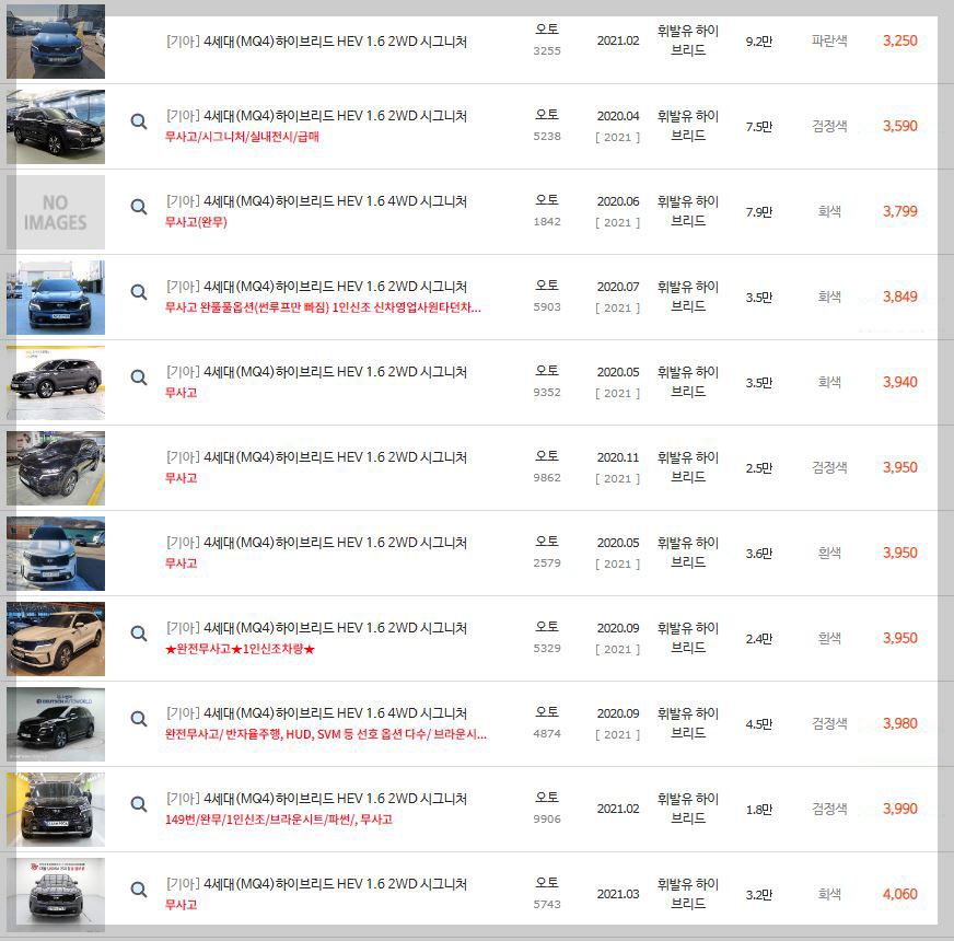 중고차매매사이트에서 본 쏘렌토하이브리드 4세대 MQ4의 노블레스의 중고차가격입니다.