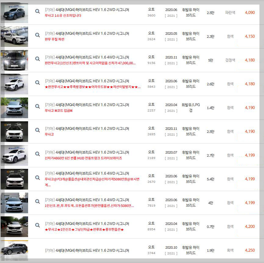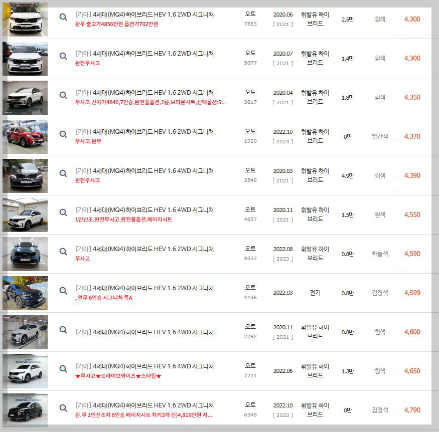 이런 신차 같은 쏘렌토하이브리드의 경우 신차의 출고가격보다 높은 5000만원이 넘어가는 가격으로 판매가 되었는데 말이죠.^^