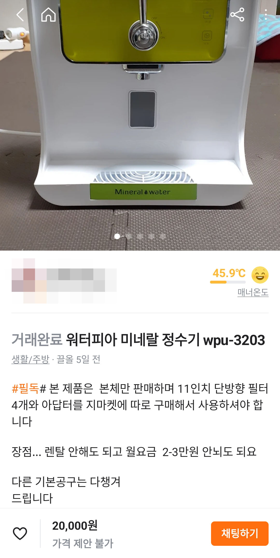 그런데 당근마켓을 보는데 위 정수기를 2만원에 판매를 하는 판매자가 있네요.