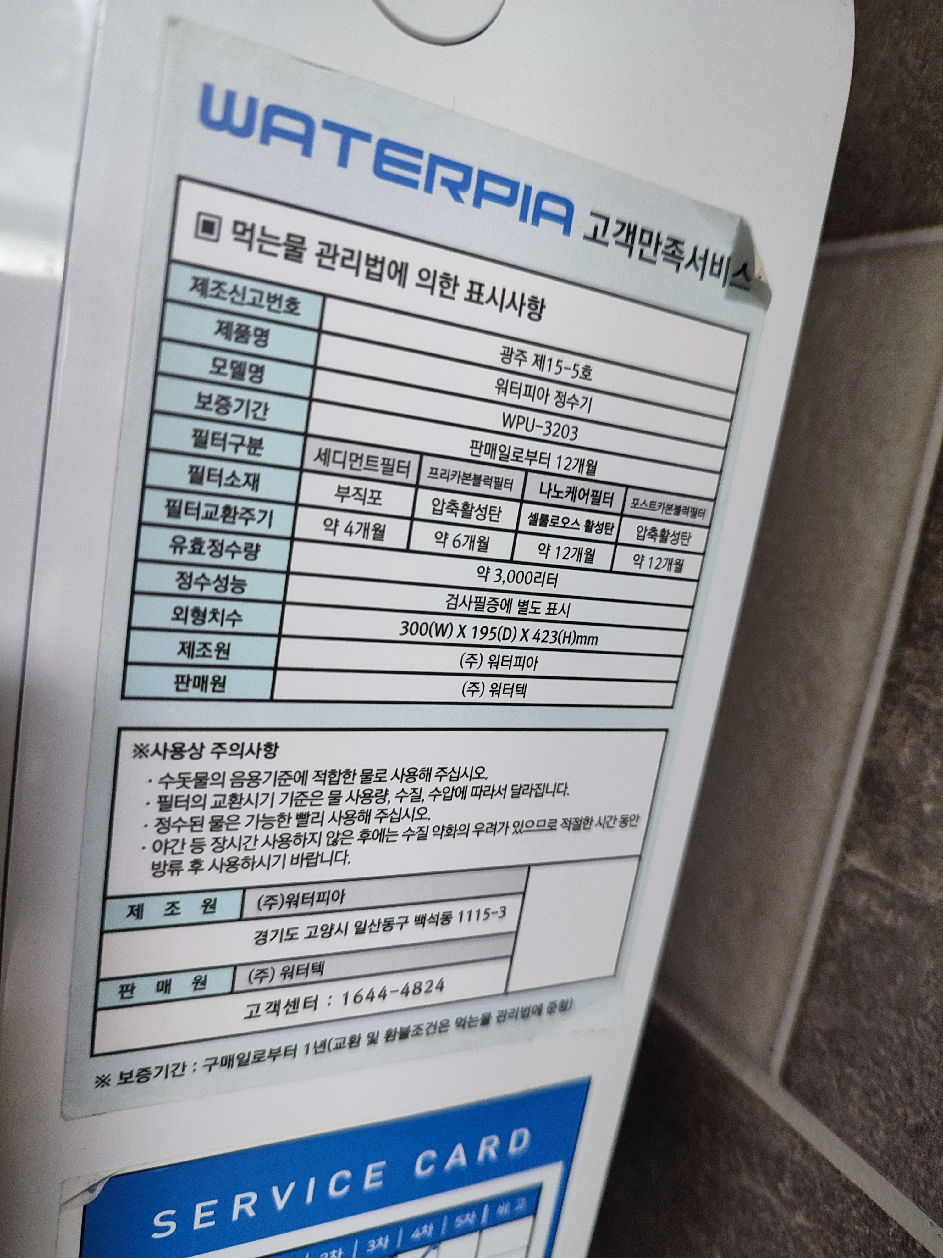 제조원은 워터피아라고 되어 있는데 판매원은 (주)워터텍이죠.