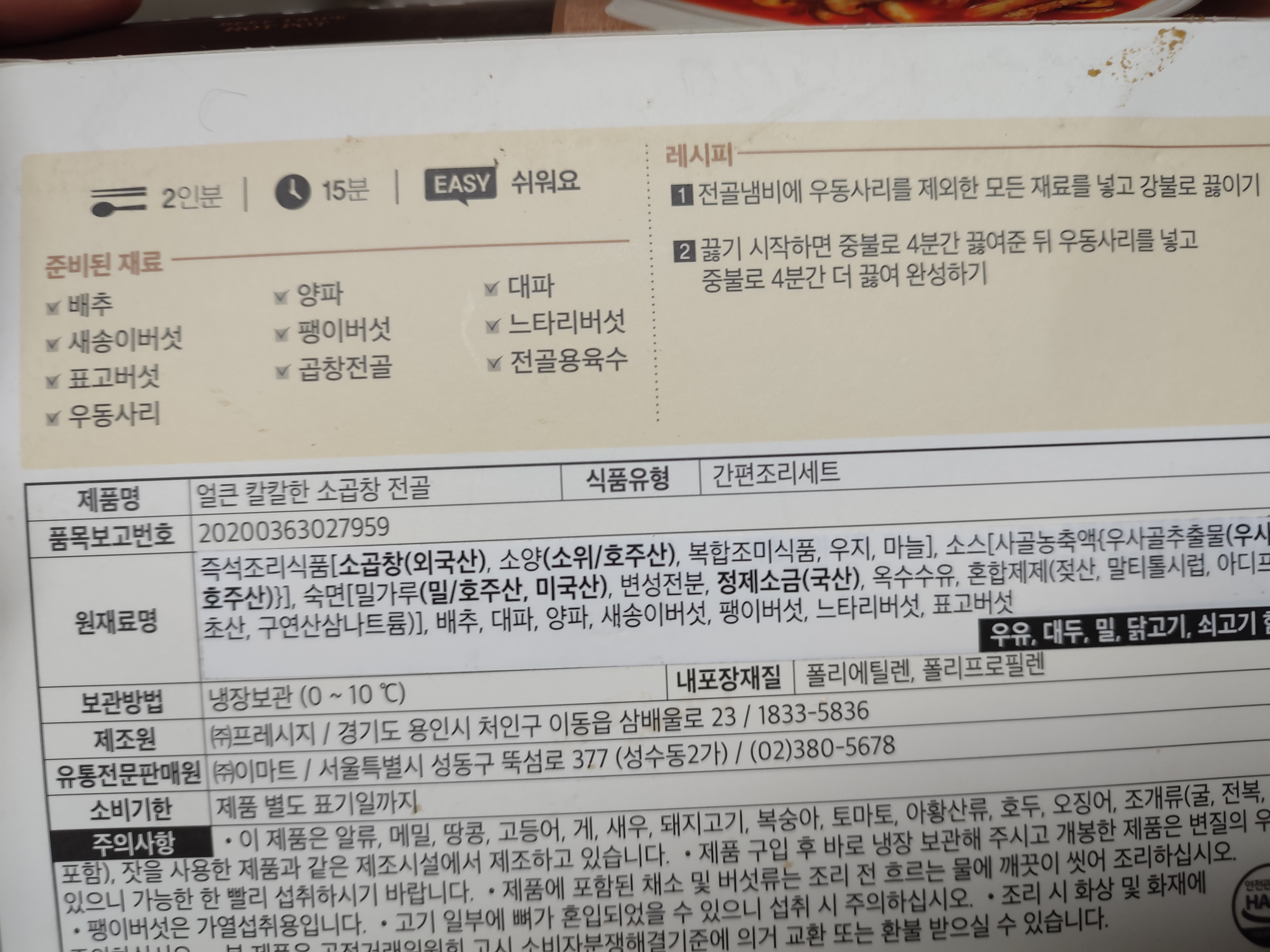 뽀글뽀글 끓는 소곱창전골이 포장지에 있는 조리예와는 많이 다르지만 그래도 맛있어 보이지 않으신가요~~