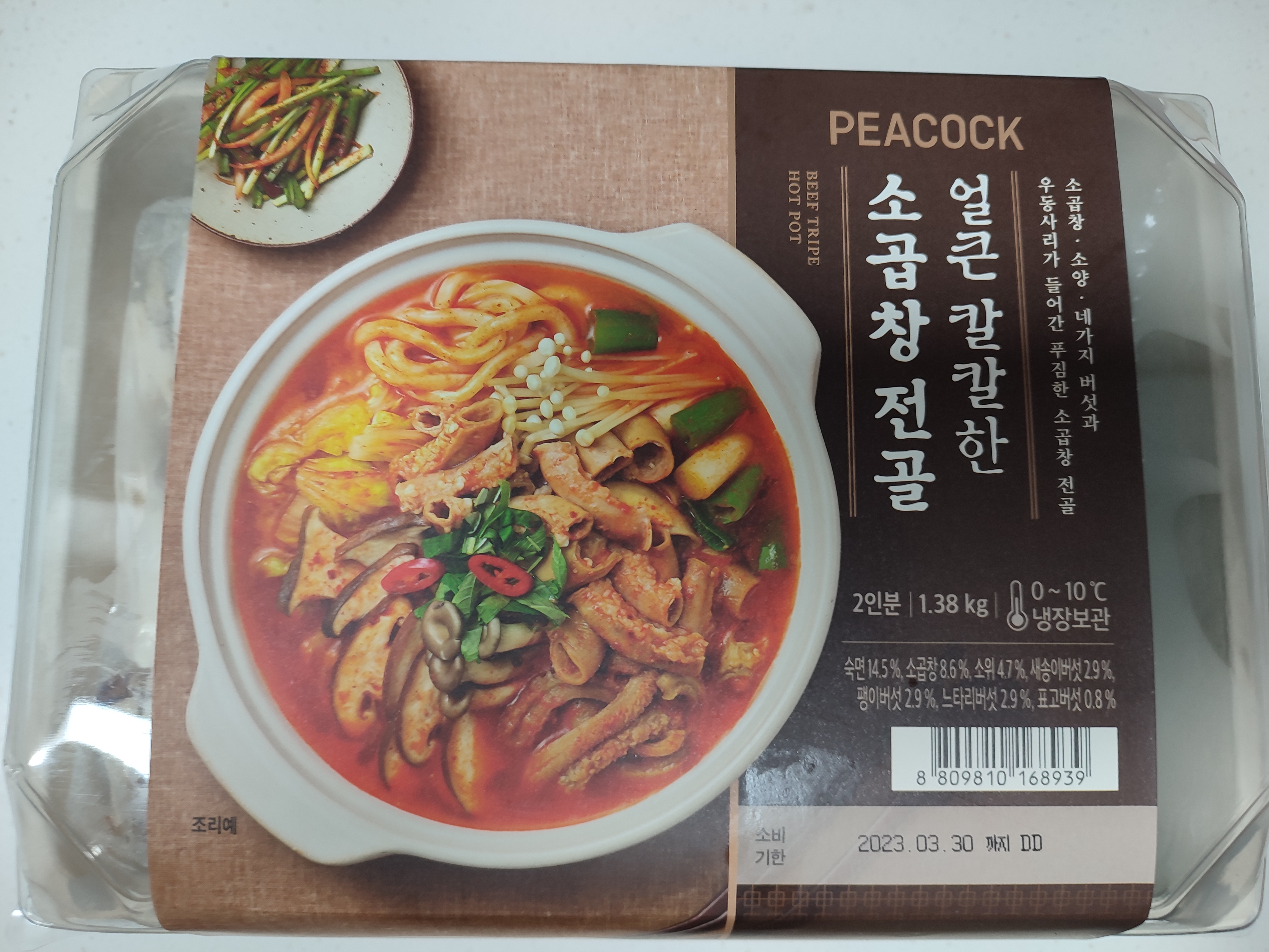 오늘 소개를 해 드릴 밀키트는 피코크에서 나온 얼큰칼칼한 소곱창전골이 되겠습니다.