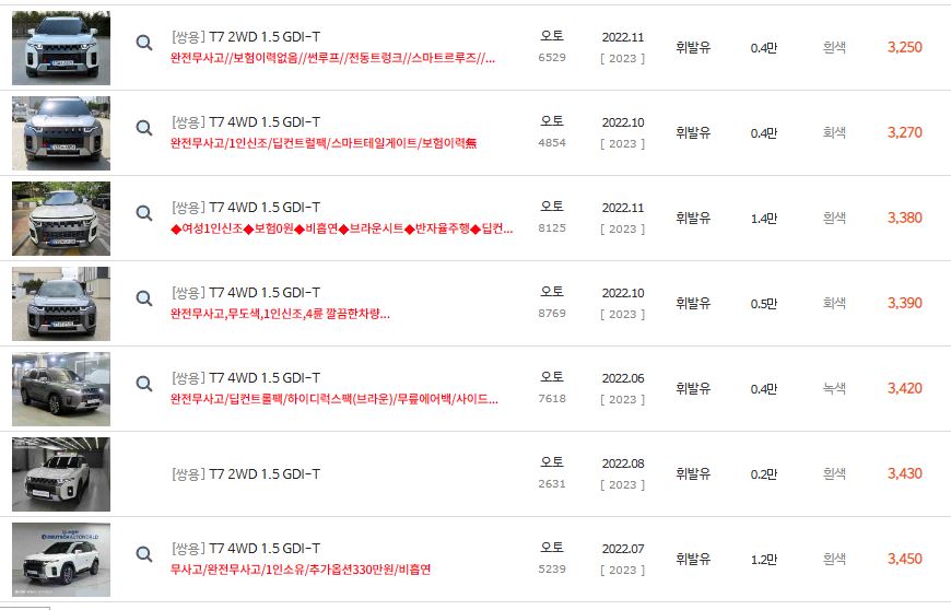 최고가에 중고차 판매가 되고 있는 토레스 T7은 3450 만원에 판매가 되고 있습니다.