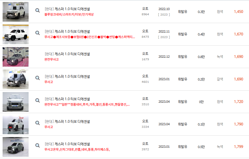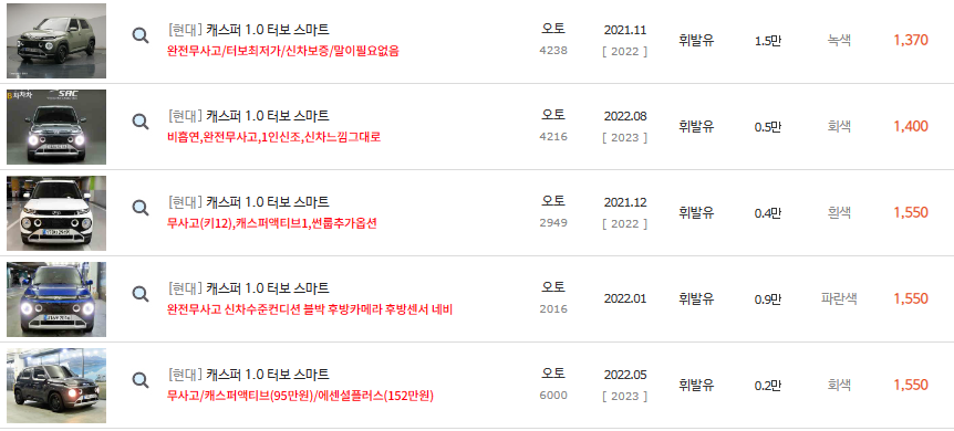 위에서 현재 중고차매매사이트에서 판매되고 있는 캐스퍼 경차의 중고차시세를 알려드렸습니다.