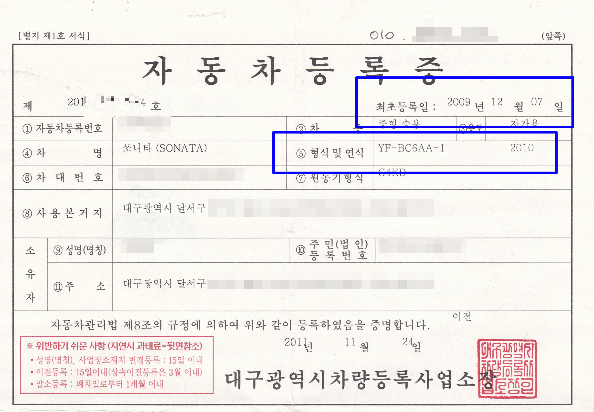 차량등록증을 보면 위와 같이 최초등록일이 있고 5 형식 및 연식이라는 것이 있습니다.