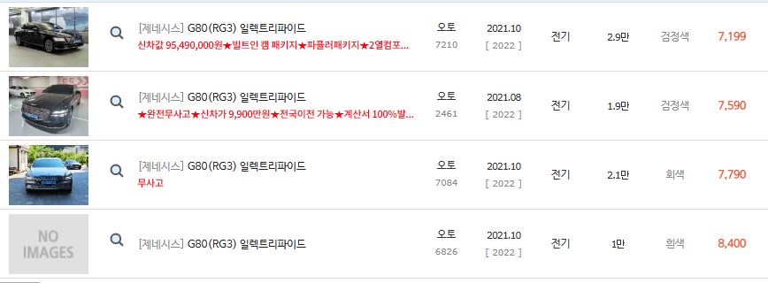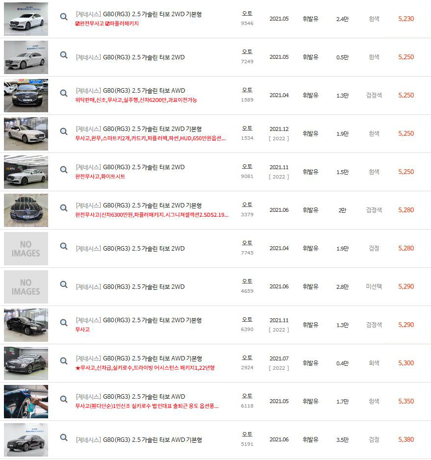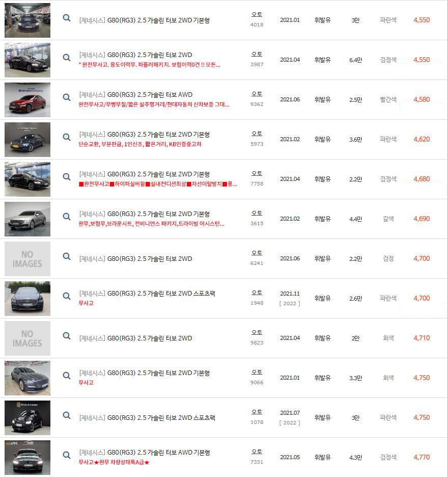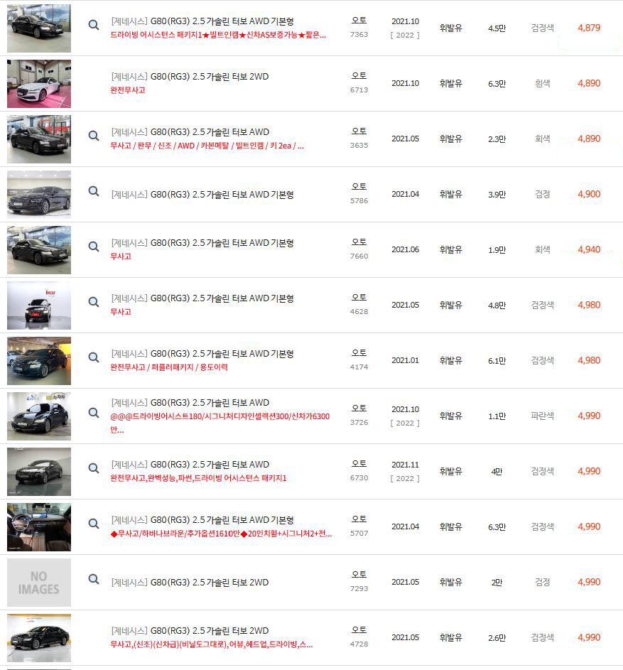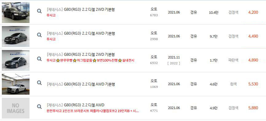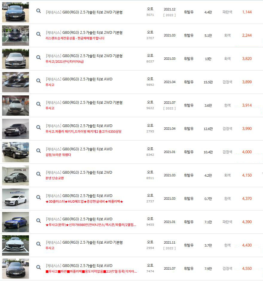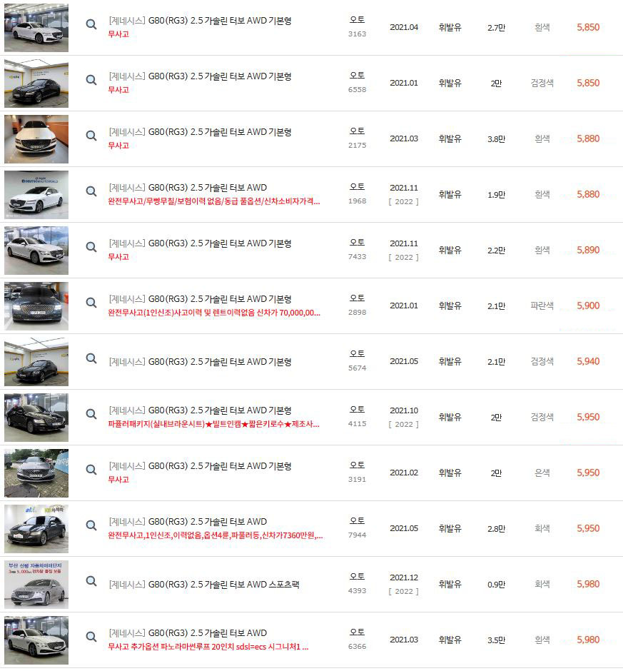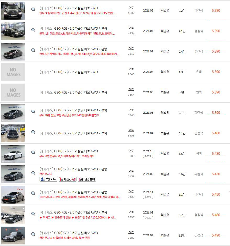 위에 보셨다시피 2021년식 제네시스 G80 2.5 가솔린의 경우 차량 댓수가 정말 많습니다.