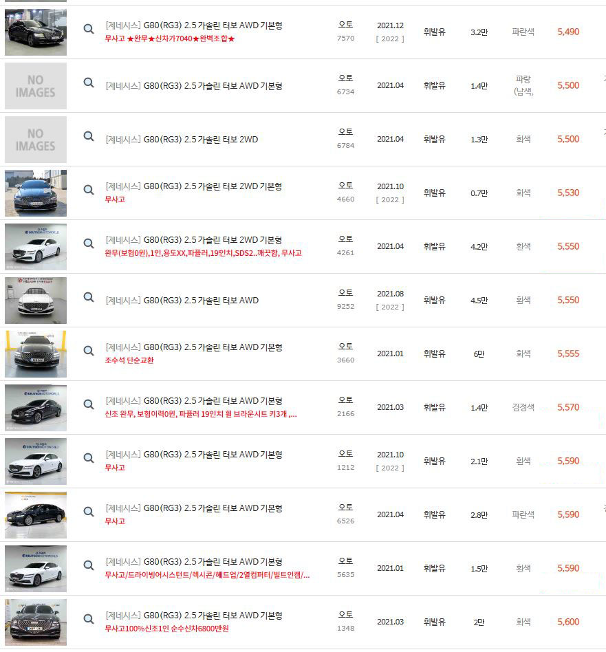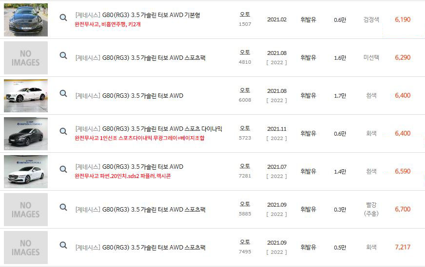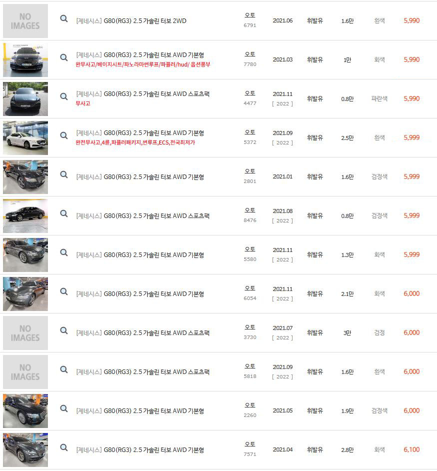 그럼 현재 중고차매매사이트에서 판매되고 있는 2021년식 G80들을 좀 더 살펴보도록 하겠습니다.