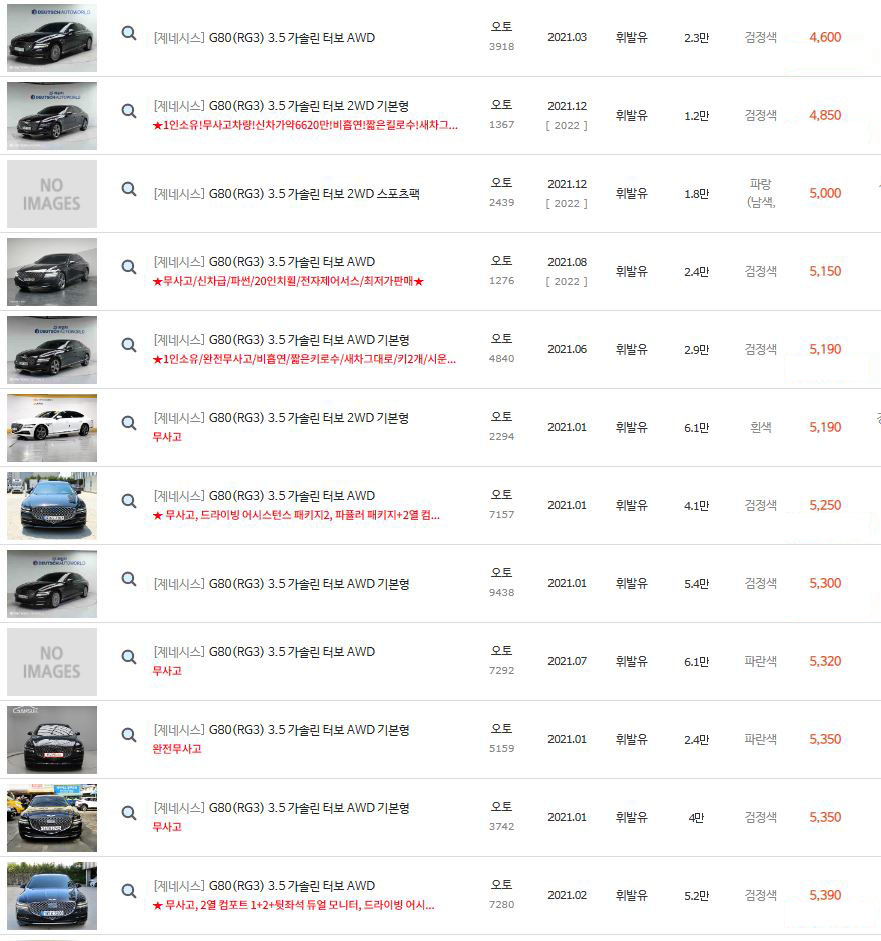 4000만원에서 4500만원까지는 중고차매물 수량이 그리 많지 않았지만 4500만원 이상되니 본격적으로 매물들이 보이고 있습니다.