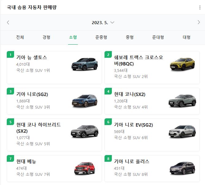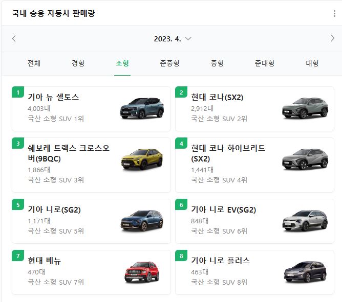 2023년 4월 소형 차량의 판매량을 보면 코나 2912대, 코나 하이브리드 1441대가 판매되었으며