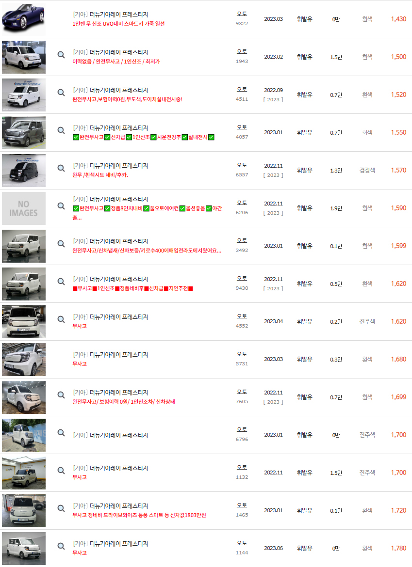 위에서 믿을 수 있는 딜러들이 서로 공유하는 중고차매매사이트에서 등록된 더뉴 기아 레이의 중고차가격을 살펴보았습니다.